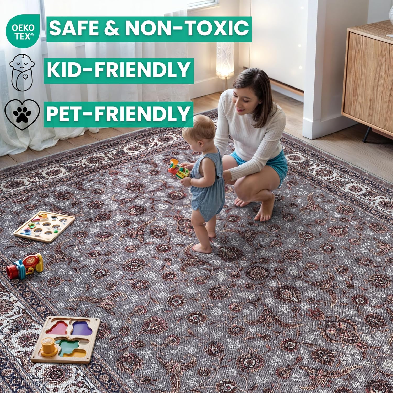 - EASY TO SETUP AND NON-SLIP: This one-piece machine washable rug with non-slip backing attached eliminates any additional setup. Simply unfold and lay flat upon arrival in the desired space. Non-slip backing prevents the rug from moving or sliding without the need for additional rug pad or grippers.