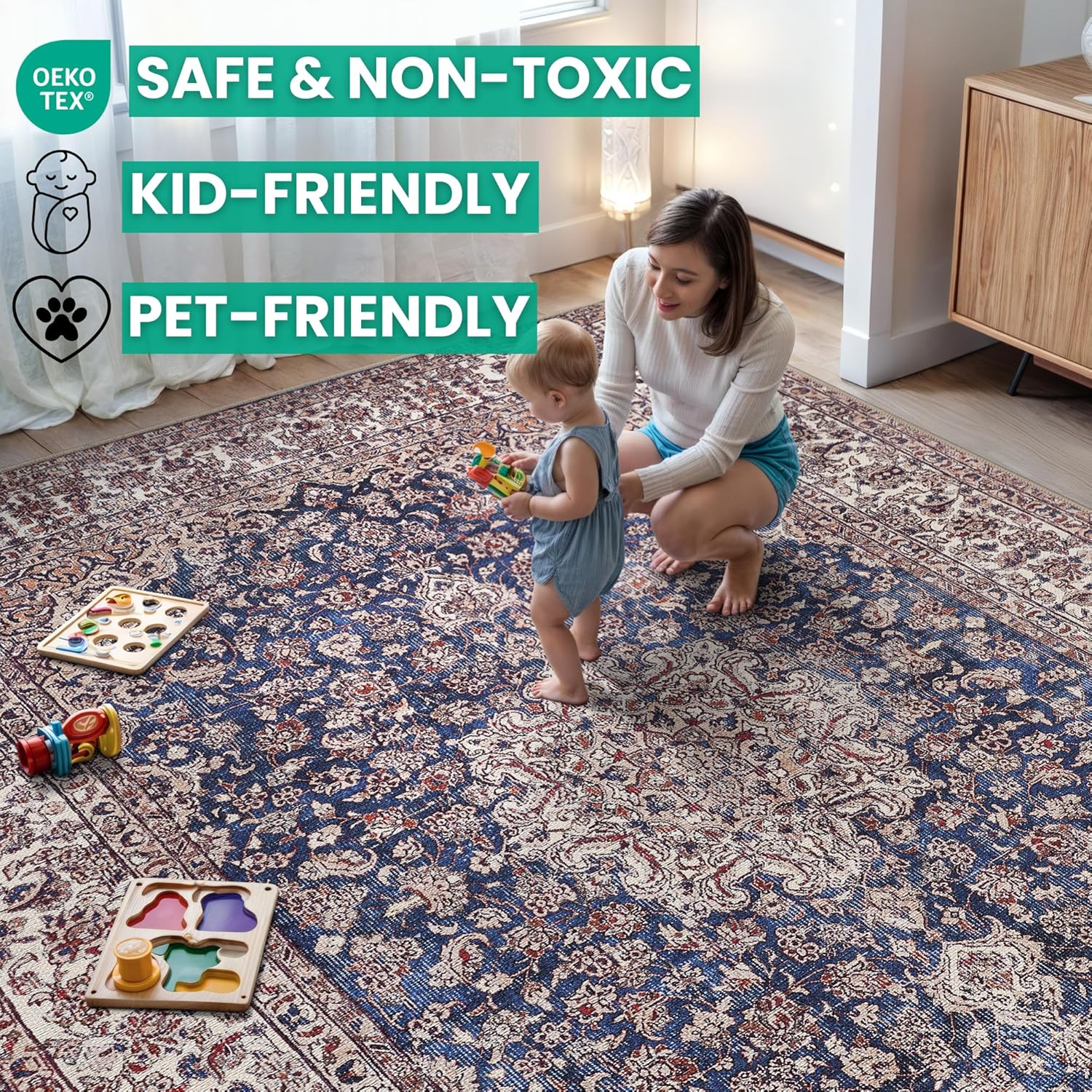 - MACHINE WASHABLE: Machine wash on delicate cycle (do not use bleach) at 85°F (30°C) and line dry or dry on air-only cycle without heat. Vacuum regularly and spot clean small stains. This easy to clean rug is perfect for families with kids and pets, and for high traffic areas.