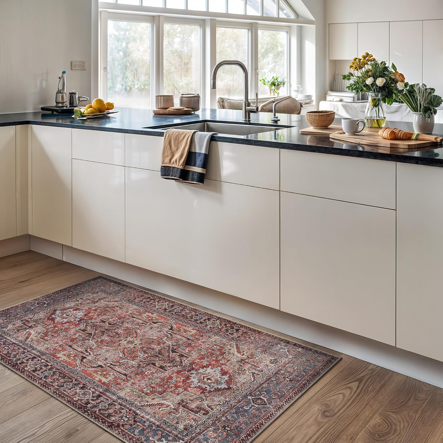 Bloom Rugs Washable Non-Slip 3' x 5' Rug - Terracotta/Blue Traditional Medallion Area Rug for Living Room, Bedroom, Dining Room, and Kitchen - Exact Size: 3' x 5'