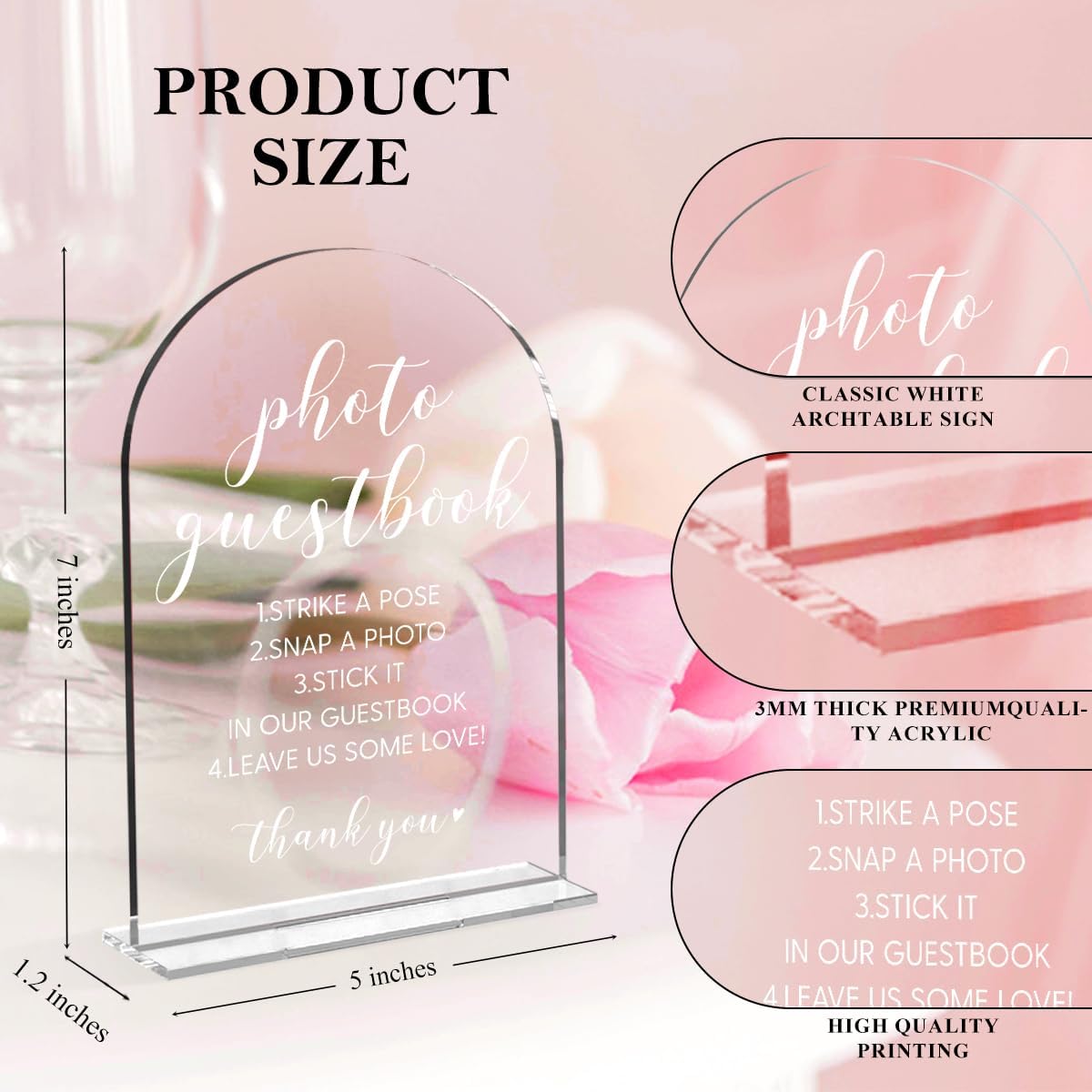 - Acrylic wedding sign is a contemporary pick, and understated elegance never falls out of fashion. We love the smooth, polished edges of these 5*7-inch acrylic wedding signs! This sign will seamlessly enhance any modern, minimalist, bohemian, indoor, or outdoor themed wedding.