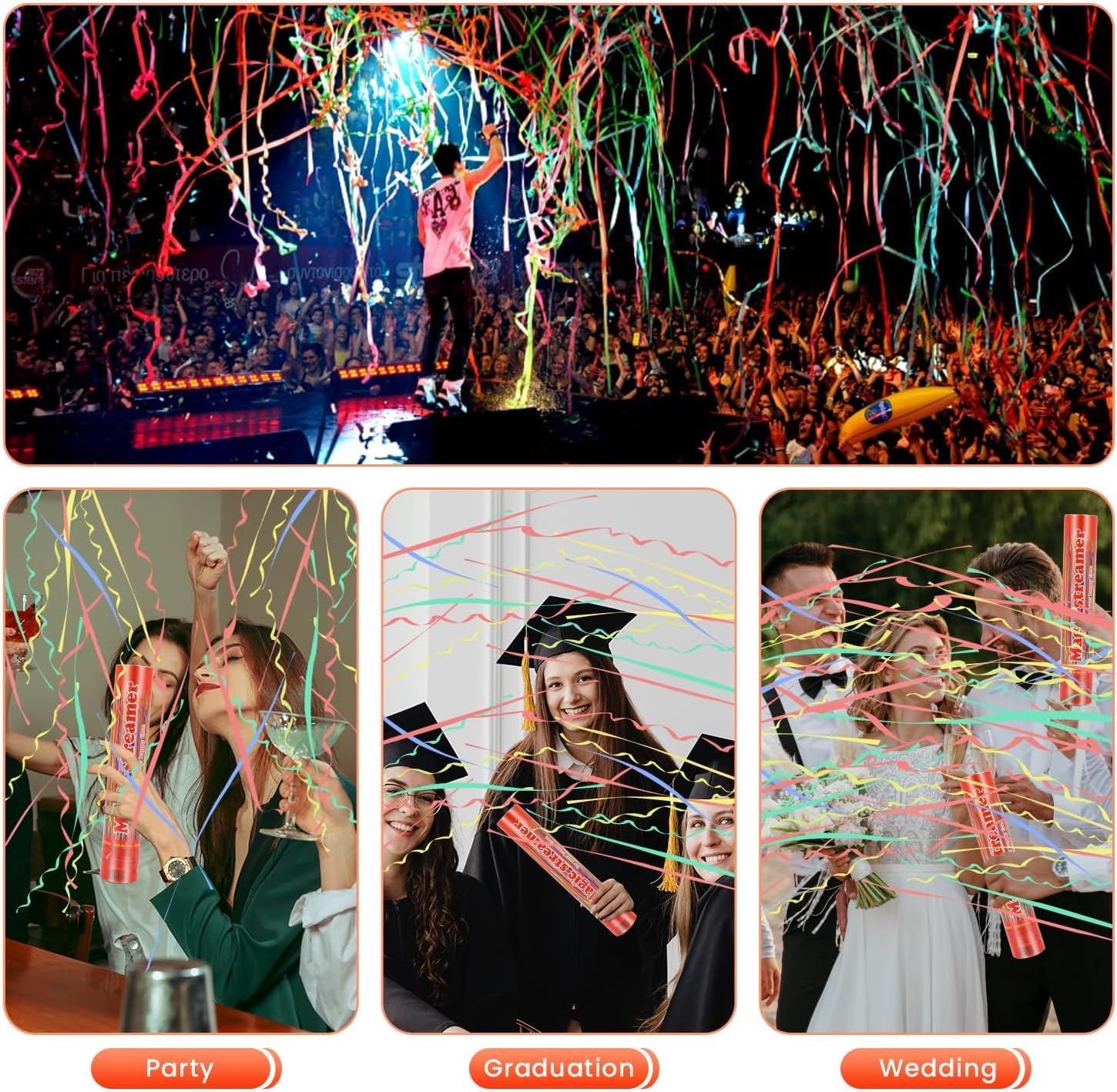 - 【12Pack Streamer Poppers】Each box includes 12pack confetti poppers filled with multi-color party poppers streamers.Great results ensure you stand out at any event, no mess, dazzling streamer spray in bring the atmosphere to a climax in the sky, give best experience for visual and photography !