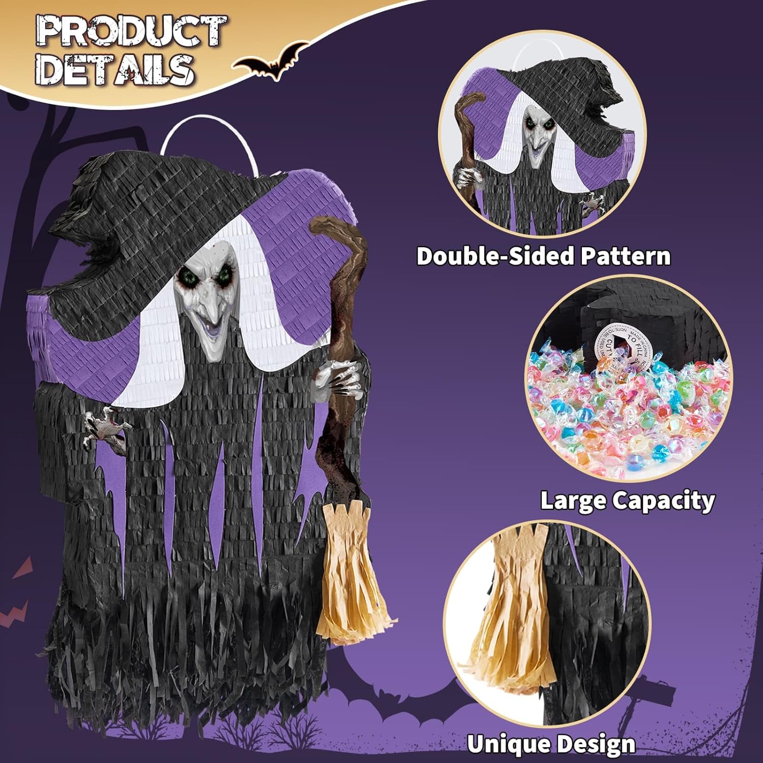 - WITCH PIÑATA - Wicked Whack Attack! This spine-chilling witch pinata stares with ghostly pale skin and sinister grin, draped in haunting purple-black robes. Swing hard—release her cursed candy stash from the broomstick’s grip! Perfect for Halloween havoc.