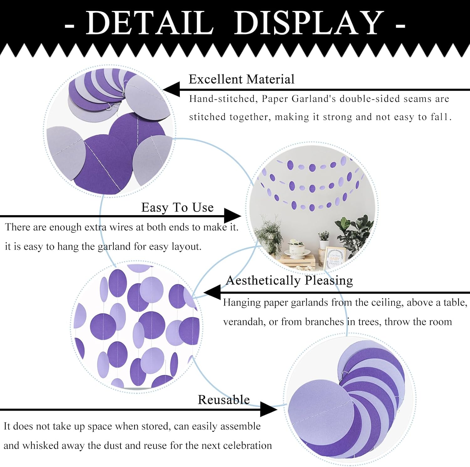 MerryNine Paper Garland 5 Pack, 50ft Glitter Paper Garland Circle Dots Hanging Decor, Banner for Baby Shower, Birthday, Nursery Party Decor (Purple)