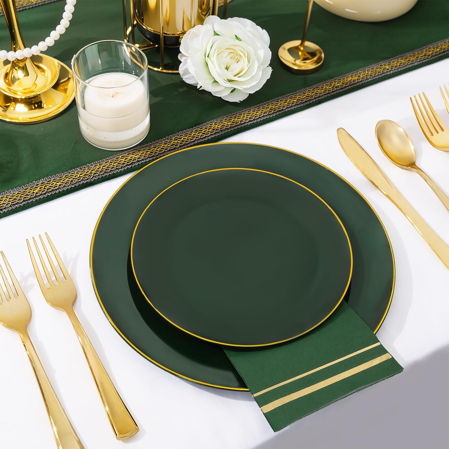 - VALUE SET FOR 50 GUESTS: NOCCUR green disposable plates contain 50 green dinner plates, 50 green dessert plates, 150 gold silverware, 50 cups and 50 green napkins.