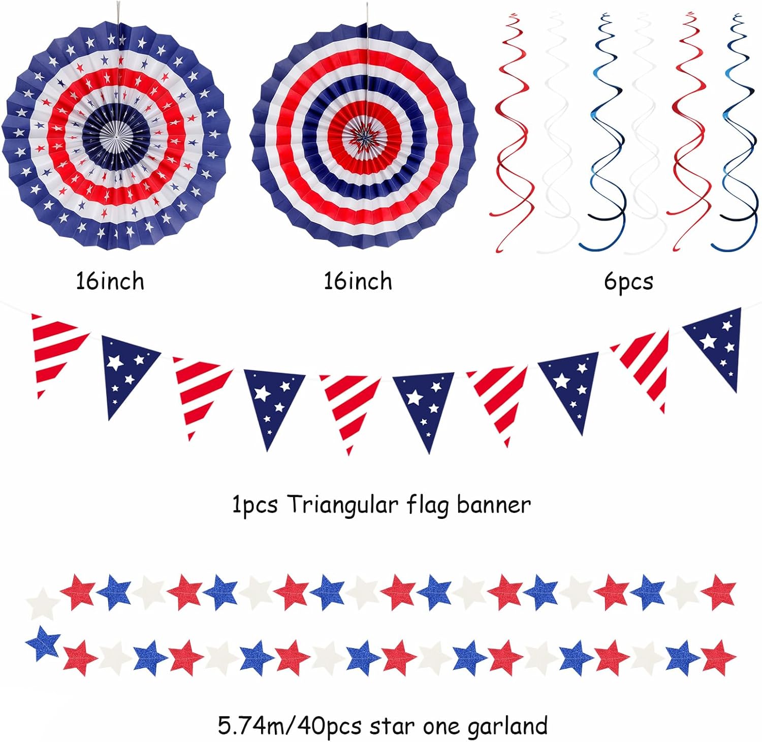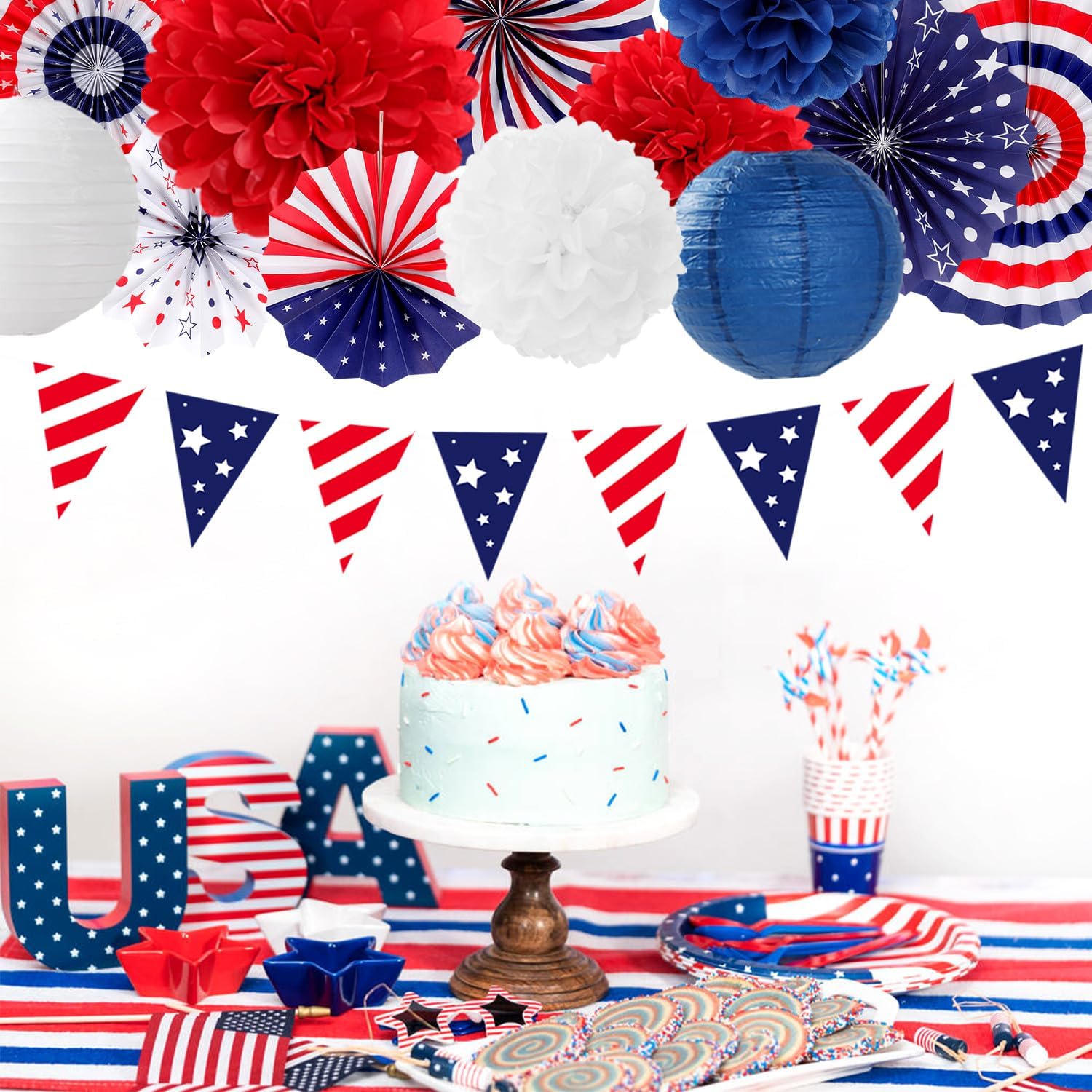 - 【Package Content】Red white royal blue party decorations contains: 1 pcs american pennant banner flags, 1 pcs star garland,3 pcs paper lanterns, 4 pcs tissue paper pom poms, 6 pcs paper fans, and 6 pcs hanging swirls. Total 21pcs in various sizes and colors.