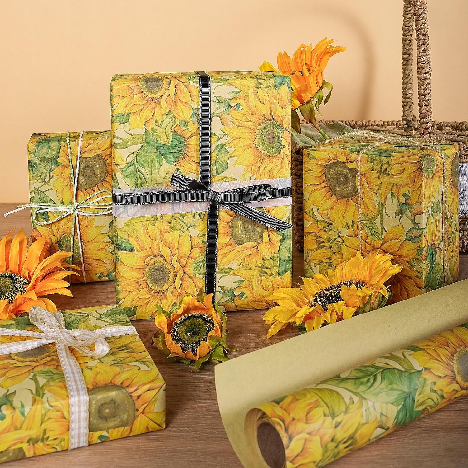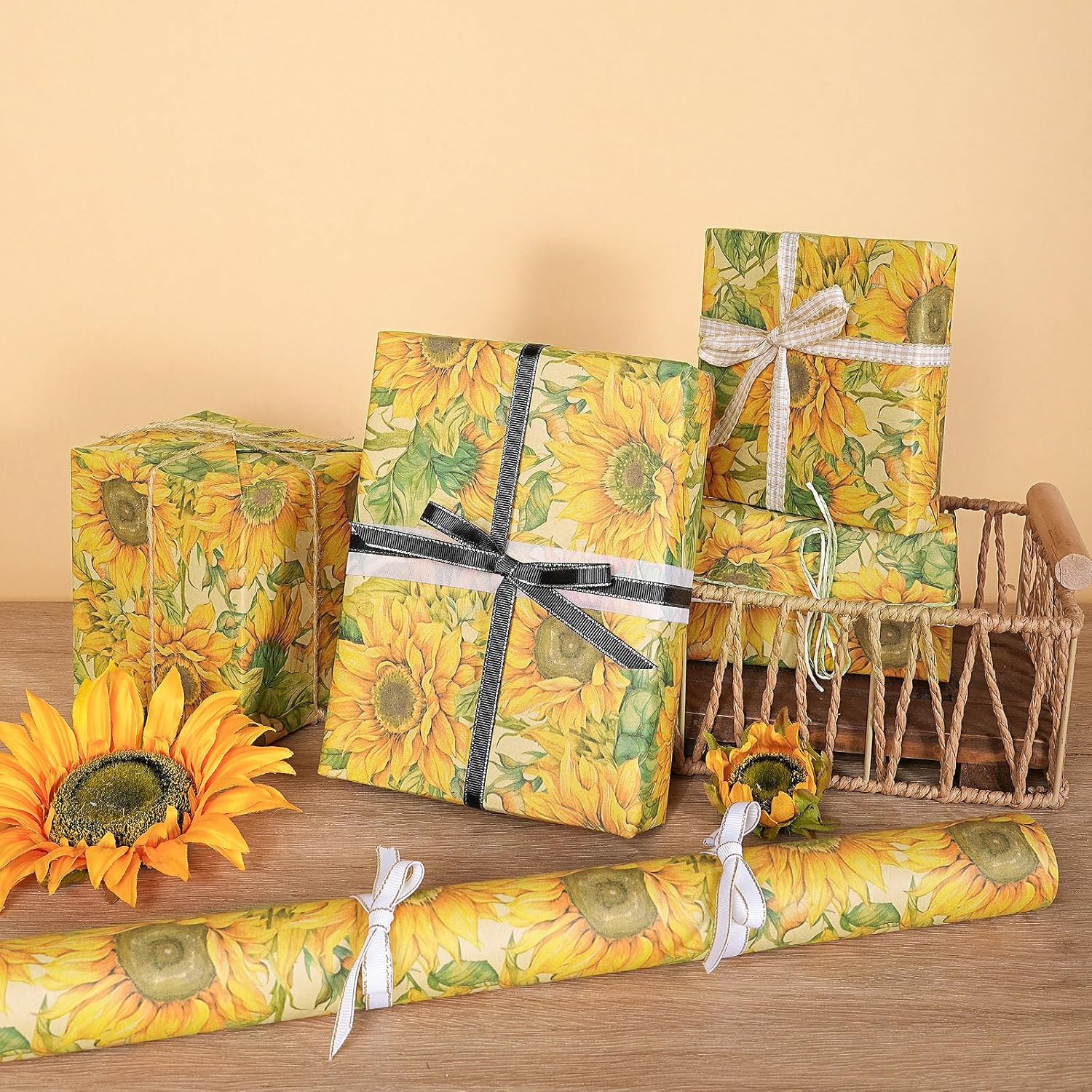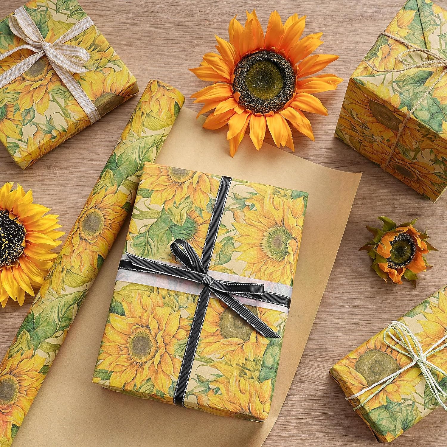 - Watercolor Sunflower Design: Features beautifully painted sunflowers in golden yellow with soft green leaves, creating a radiant floral pattern on rustic kraft paper. Perfect for adding joy and charm to fall gift giving
