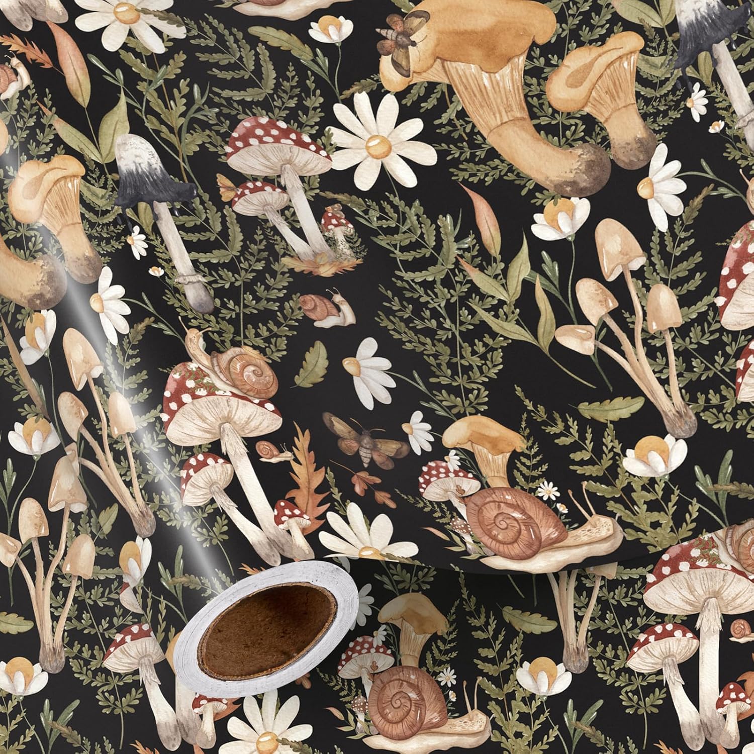 RUSPEPA Forest Mushroom Wrapping Paper Roll, Mini Roll, Woodland Squirrel and Snail Design, Black Nature Gift Wrap for Fall, Birthday, Thanksgiving Party, 17 Inches x 16.4 Feet