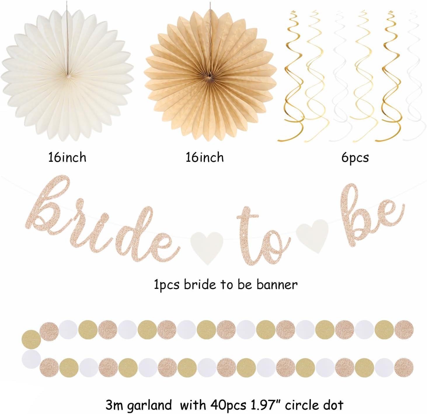 - 【Champagne Gold Beige Blush Pink Party Decorations kits】This kits include 1pcs bride to be banner, 1pcs circle dots paper banner, 4pcs tissue flower pom poms: 3pcs 10" and 1pcs 12" , 3pcs 8inch paper honeycom ball, 2pcs 8inch paper lantern, 4pcs 12inch paper fan, 6pcs Paper swirls hanging streamers