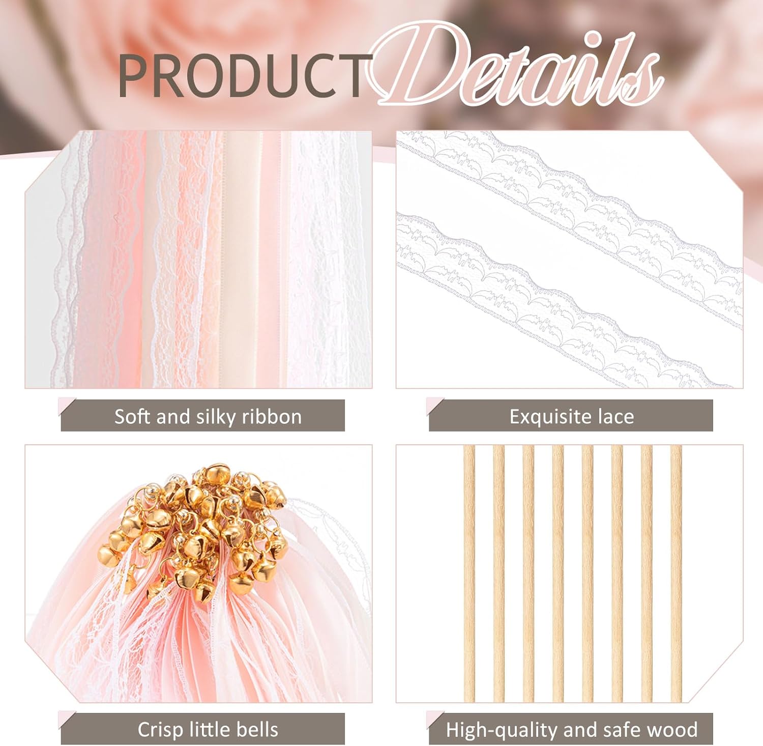 - Easily Create a Cheerful Ambiance: the fairy wand is tied with fluttering ribbons, elegant lace and delicate bell, guests can wave them to add ambiance to your wedding; It also can serve as a photo prop when you need to take a group photo; These ribbon sticks are also exquisite props for games or celebrations