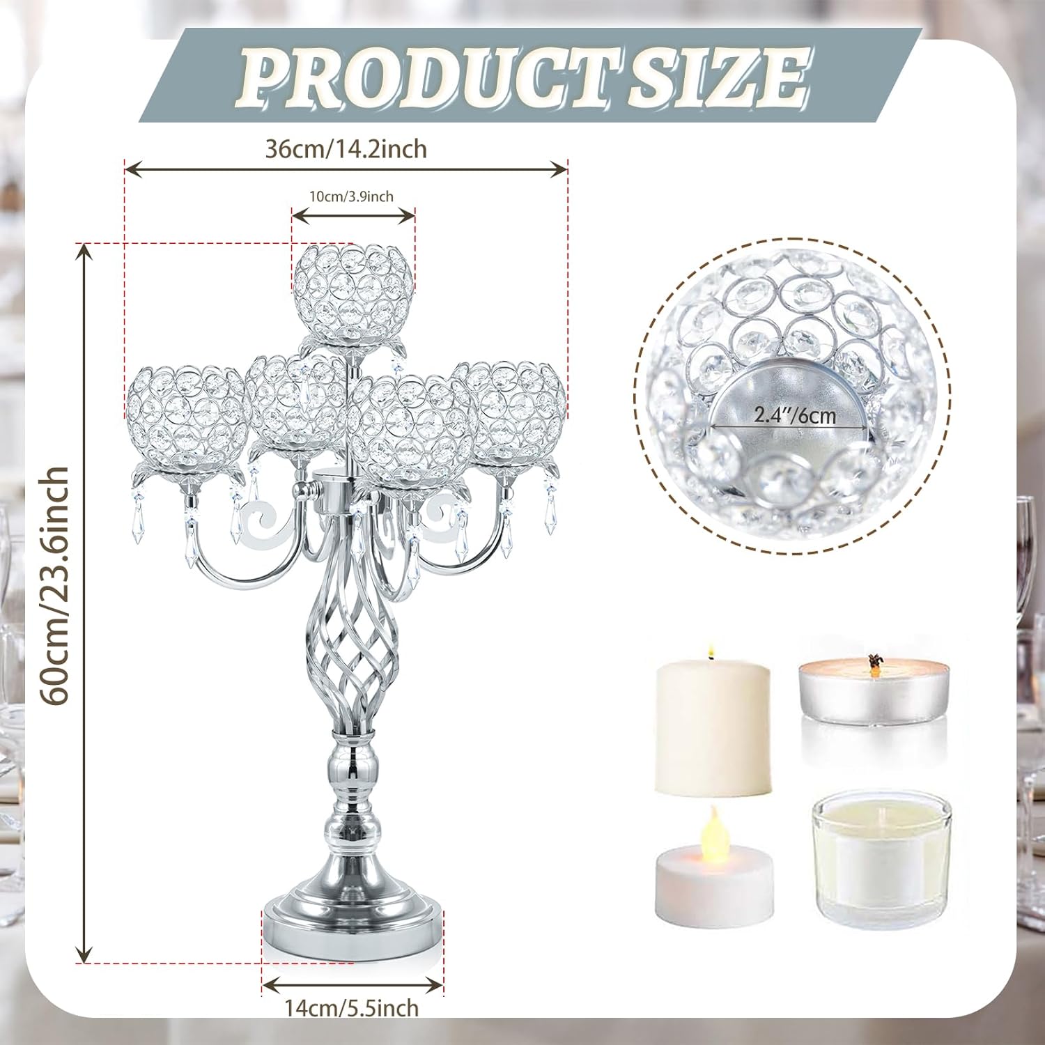 5-Arm Crystal Candelabra Centerpiece 23.2" Tall - Elegant Candle Holder Stand with Crystal Bowl, Chic Table Decor for Weddings, Parties, Anniversary & Home Decoration (2, Silver)