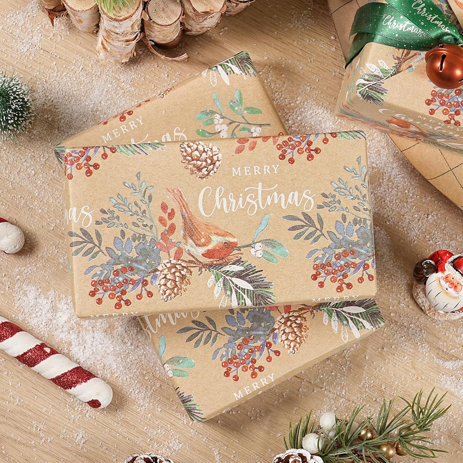 - Holiday Bird Design: Features a charming watercolor-style robin perched on pine branches with red berries, pinecones and snowy foliage. The soft, natural color palette adds a nostalgic and heartwarming feel to your holiday wrapping