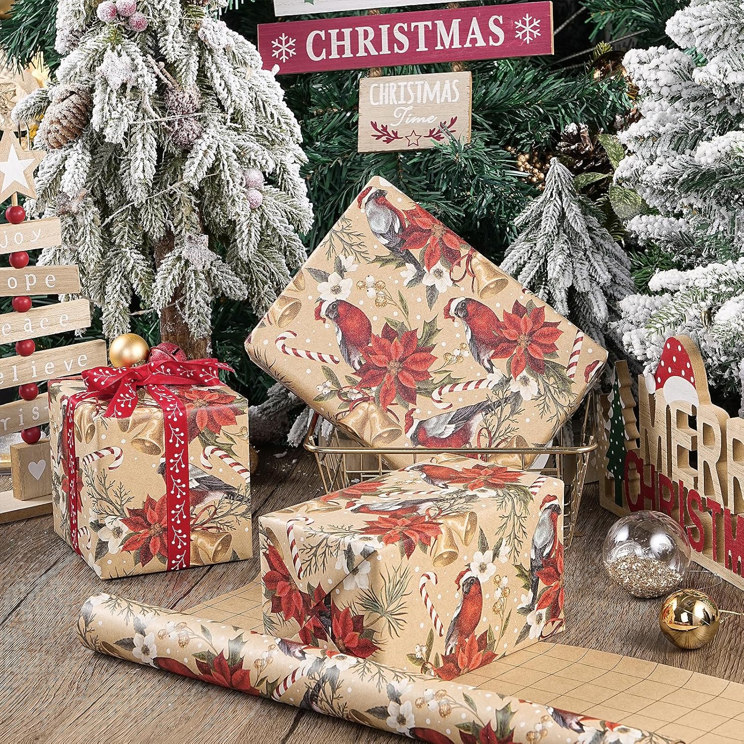 - Vintage Christmas Design: Features beautifully illustrated cardinal birds wearing Santa hats, vivid red poinsettias, elegant golden bells, candy canes and lush winter greenery, all printed on a vintage kraft background that adds warmth and charm to your holiday gifts