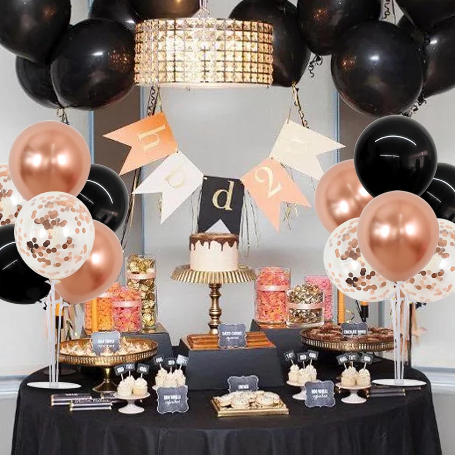 - Package Includes: The balloon arch kit includes 4 reusable balloon centerpiece table decorations and 12inch 32 pcs Latex Balloons (14 rose gold balloons,9 black balloons,9 rose gold confetti balloons),glue point dots,balloon pump,balloon clips,and tie tool.You don’t need to waste money to buy balloons