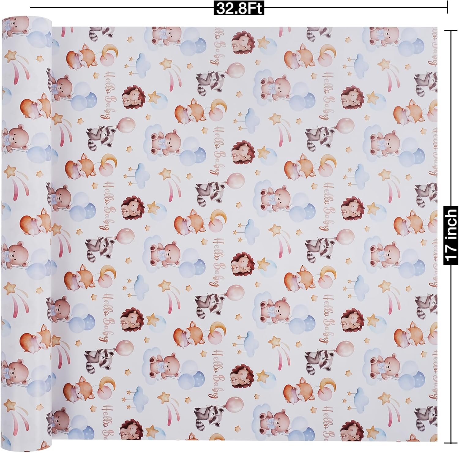 Aimyoo Baby Shower Wrapping Paper Roll - 17 Inch x 32.8 Feet - Cute Animal with Hello Baby Letter Design Perfect for Boys Girls, Birthday, Party