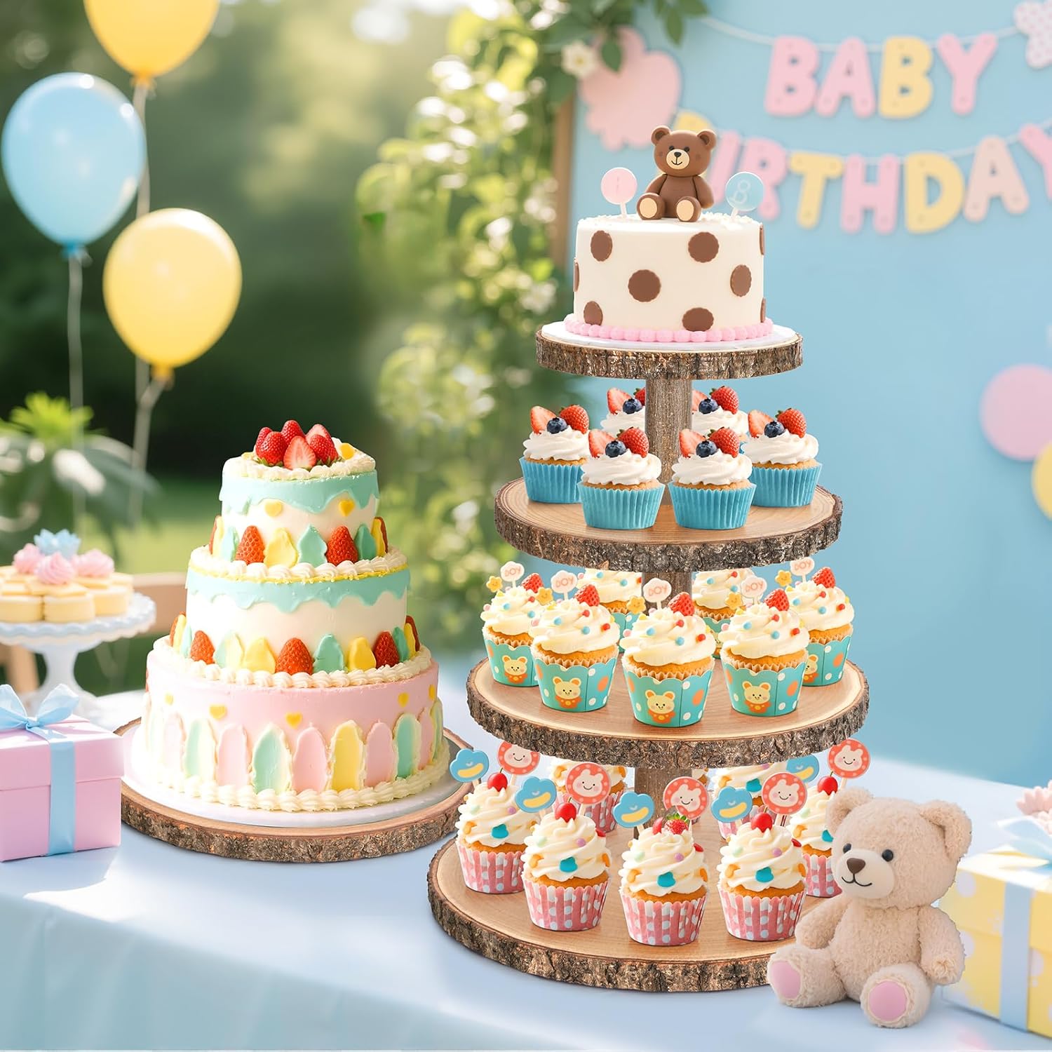 - Rustic cupcake tower : cupcake tier stand Made from natural Paulownia wood, the cupcake stand retains the real bark, and each wooden tray has annual ring wood grain, woodland themed party must haves for hosting