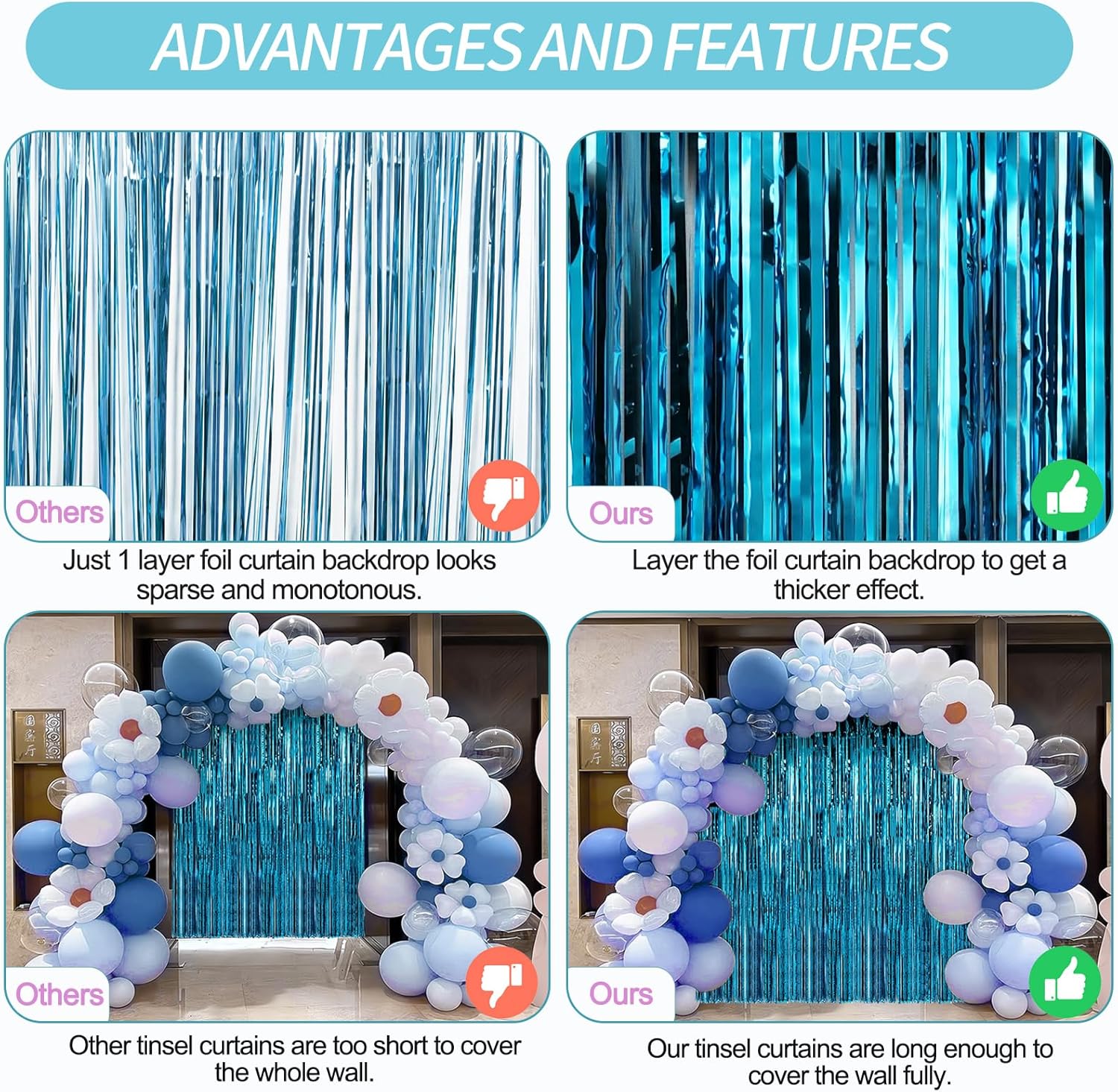 - Customer Service - We offer 2 packs of foil fringe curtain backdrops, each measuring 3.3 ft x 8.2 ft. Enough length for hanging on a door or covering a wall fully, suitable for any party. If you are unsatisfied with our door streamer party decorations, please do not hesitate to contact us. We guarantee a 100% full money-back refund.