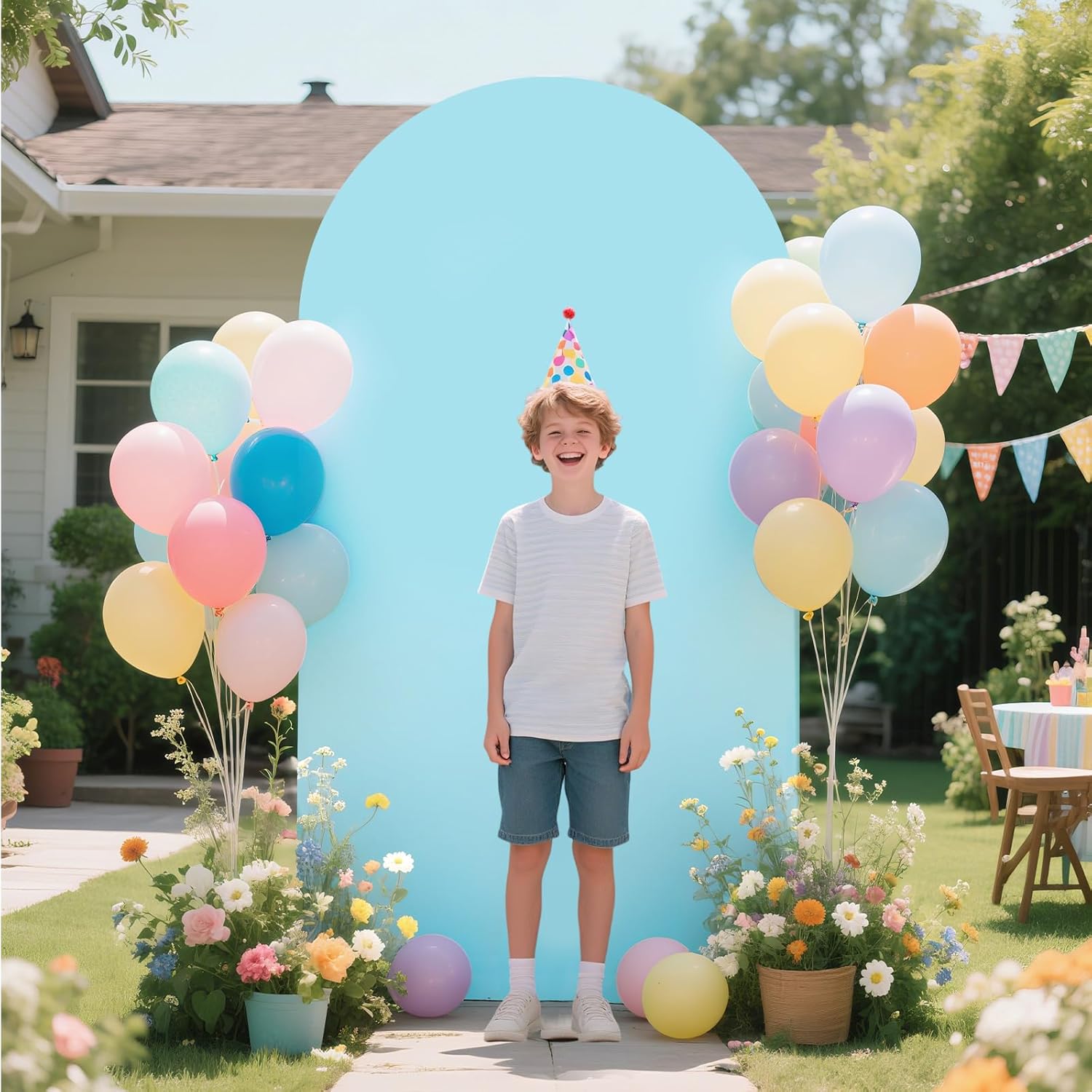 - 【Arch Covers Package】6FT arch cover (Arch stand not included), color: Light Blue. We have arch backdrop covers of different sizes --- size: 7.2 feet x 4 feet (H x W) / 6 feet x 2.6 feet (H x W). Please measure the size of the arch in your home before purchasing and choose the appropriate backdrop cover. If you have any questions, please feel free to contact us at any time.