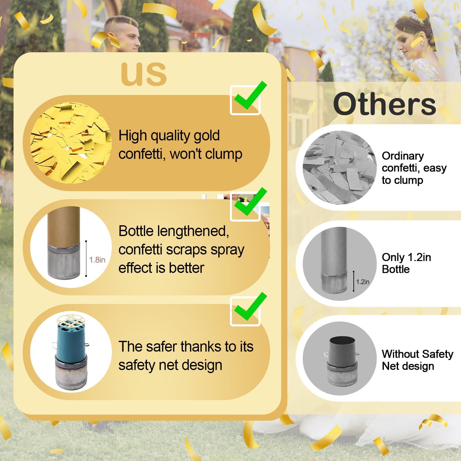 - Specifications: You will receive 6 packs of 12 inch confetti cannons. Each confetti cannon is filled with gold confetti for all parties.