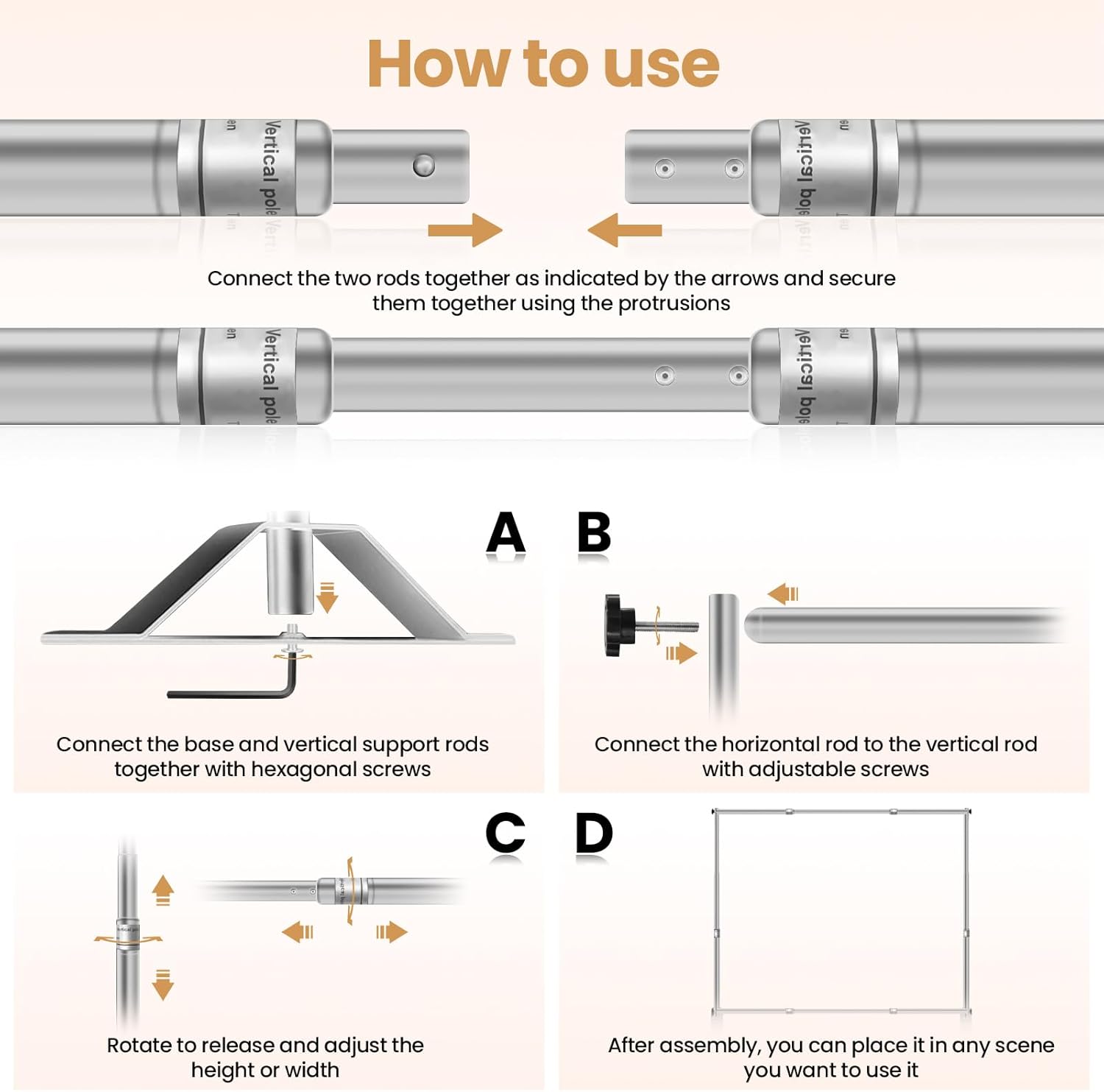 - 【Adjustable Frame】: The telescopic banner stand is suitable for multiple size, They are all telescopic and can be infinitely adjusted to match the size you need, Height adjustable (Min 3.4ft - Max 10ft), width adjustable (Min 6.2ft - Max 10ft).