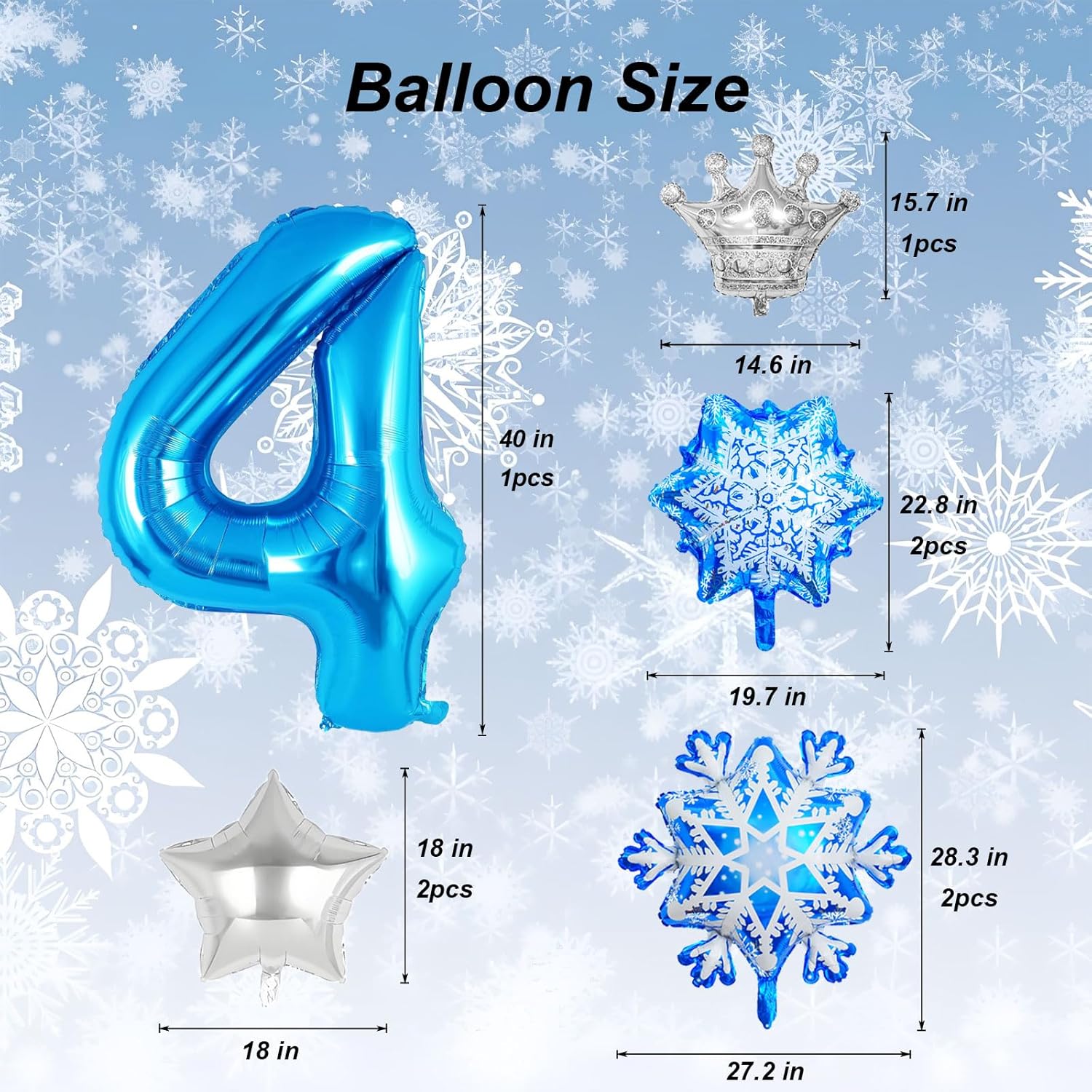 - 【Package】You will get 8pcs snowflake balloons, include one 40in blue number balloon two 27.2*28.3in snowflake balloons two 19.7*22.8in snowflake balloons two 18in silver star balloons one mini crown balloon ,and one straw with one ribbon.