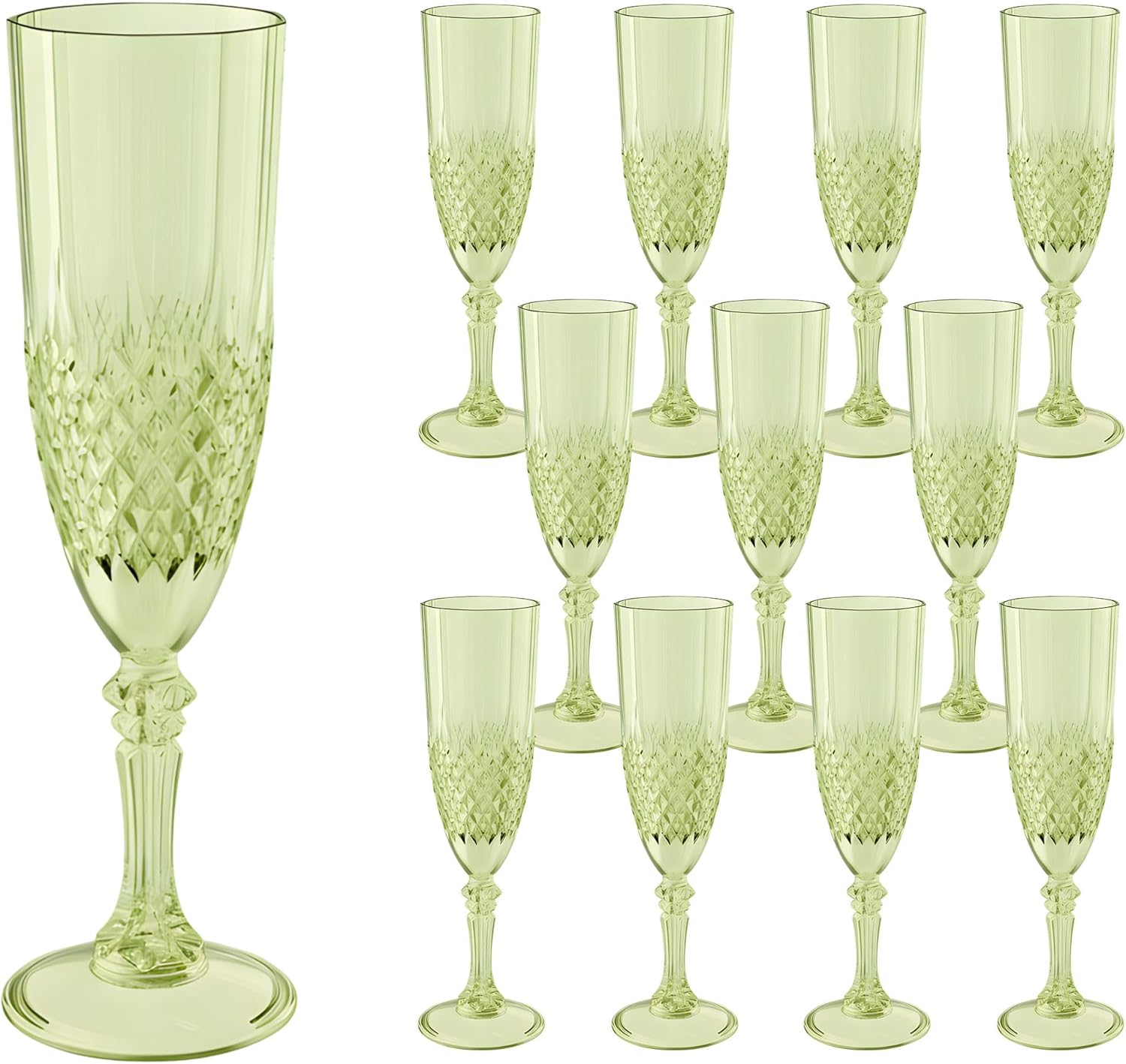 - Charming Set: Champagne flutes set include 12 retro-style green champagne plastic wine glasses, providing ample quantity to meet your daily use and replacement needs. A suitable champagne cup is the icing on the cake. Plastic wine glasses not only carry the wine, but also carries the laughter and blessings