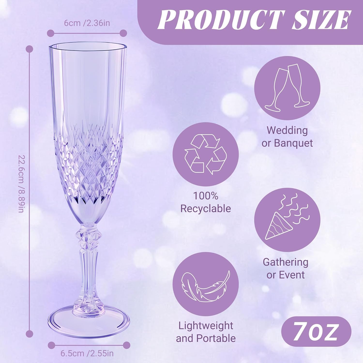 - Suitable Size: Champagne glasses are of appropriate size, with a base that is a round pedestal with a diameter of 2.55 inches, a mouth diameter of 2.36 inches, and a height of 8.89 inches. Plastic champagne flutes hold 7 ounces. This size is both easy to hold in one hand and provides ample space for the bubbles to rise, ensuring each sip of champagne is rich in texture and aroma. It is an essential item for anyone who loves life and knows how to enjoy it