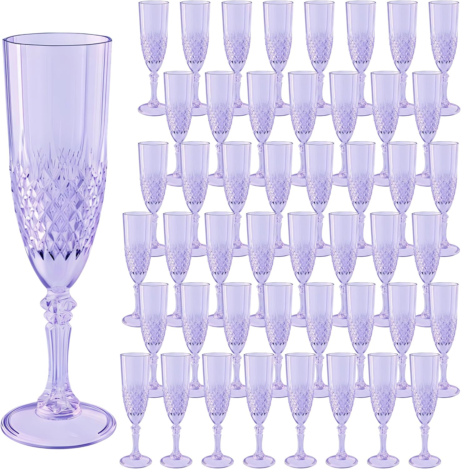 - Charming Set: Champagne flutes set include 48 retro-style light purple champagne plastic wine glasses, providing ample quantity to meet your daily use and replacement needs. A suitable champagne cup is the icing on the cake. Plastic wine glasses not only carry the wine, but also carries the laughter and blessings