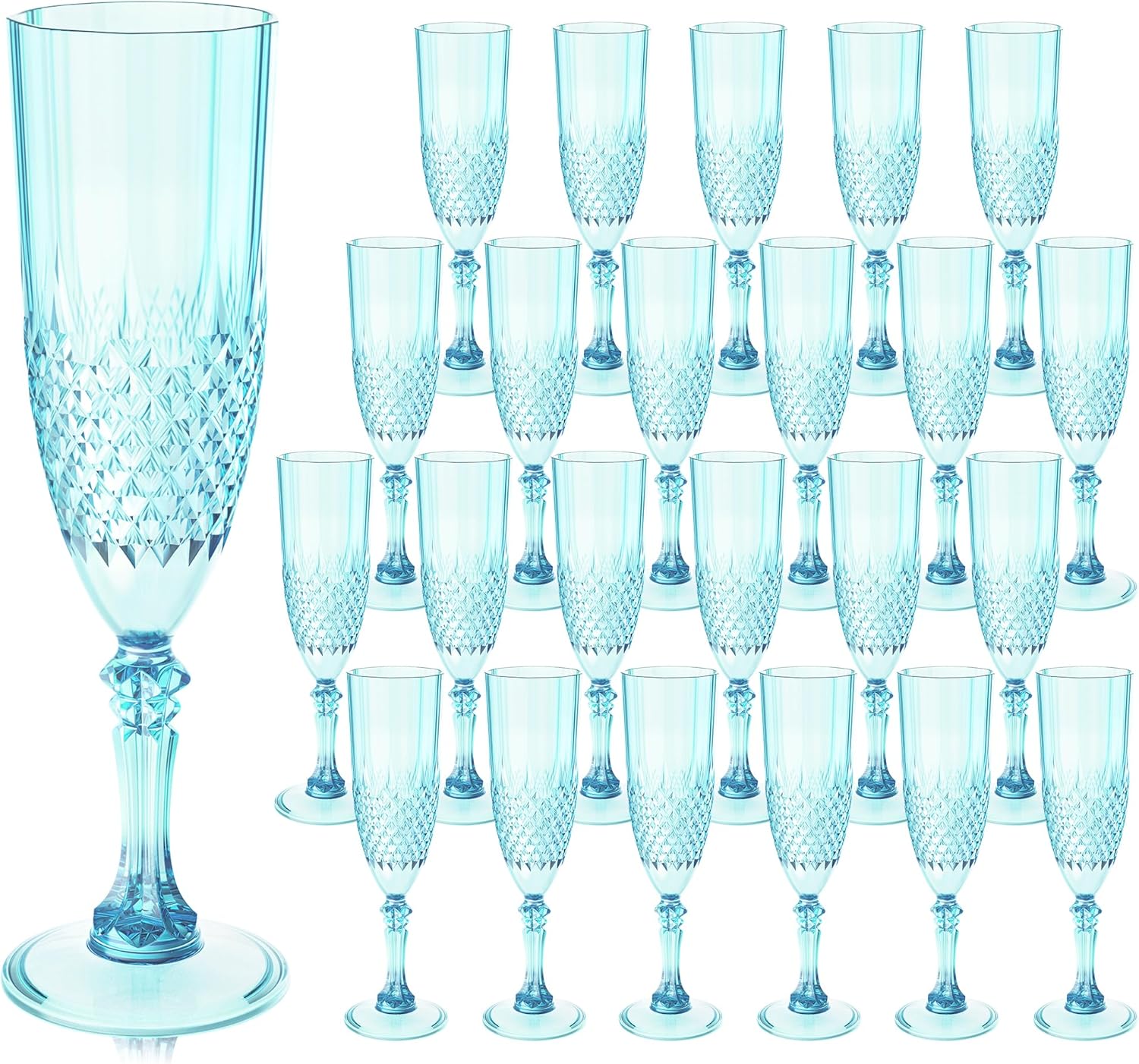 - Charming Set: Champagne flutes set include 24 retro-style light cyan champagne plastic wine glasses, providing ample quantity to meet your daily use and replacement needs. A suitable champagne cup is the icing on the cake. Plastic wine glasses not only carry the wine, but also carries the laughter and blessings
