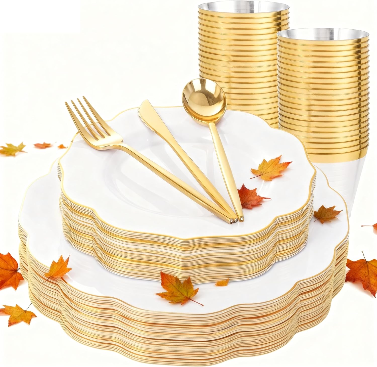 bUCLA 180PCS White and Gold Plastic Plates Disposable - White with Gold Rim Dinnerware Set Include 30 Guests Dinner & Dessert Plates, Cups, Cutlery Set for Wedding, Party & Thanksgiving Table Decor