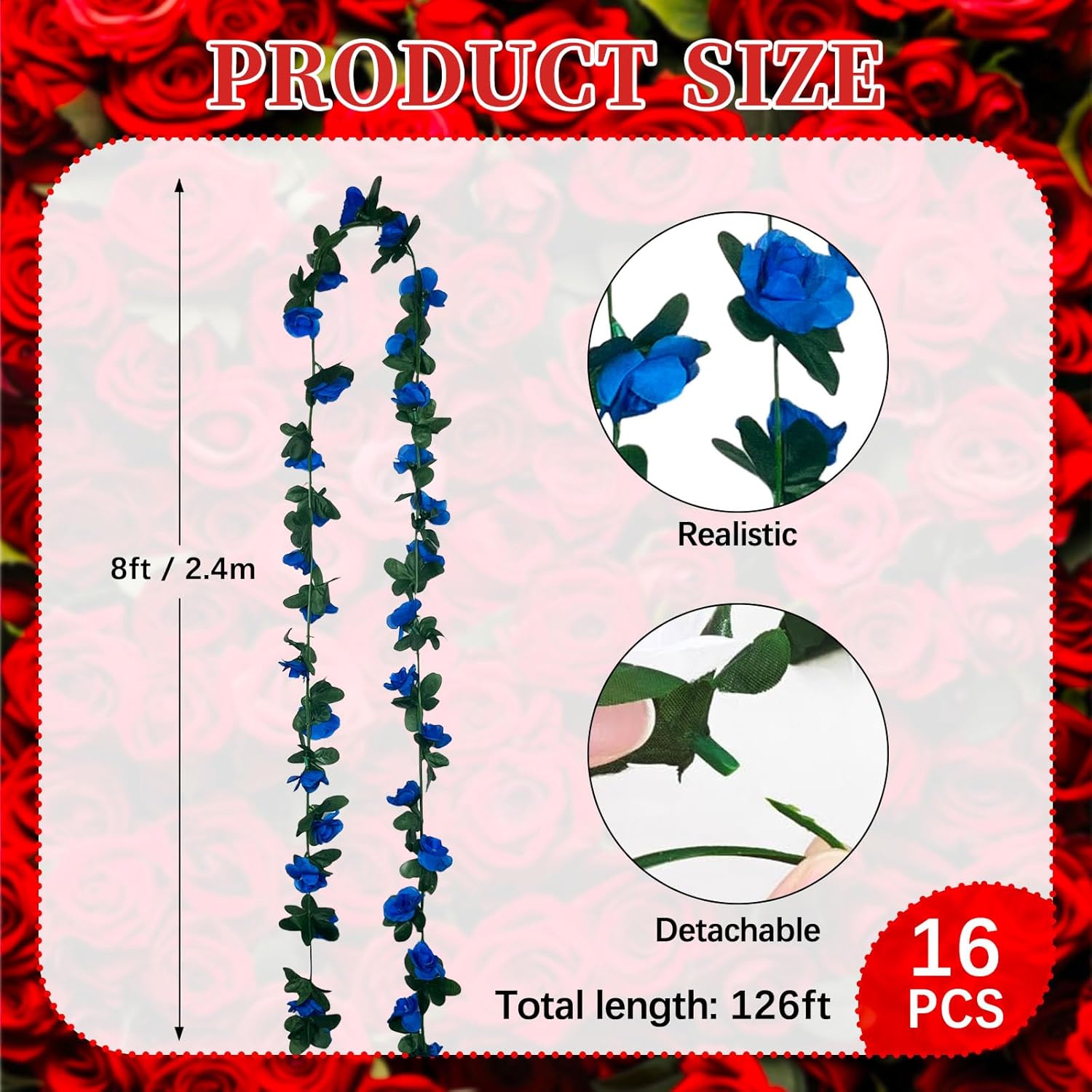 - 【Packaging and Size】The package includes 16 pcs rose flowers vines, each length 7.87 ft. Each rose garland has 45 rose flowers, the diameter of the rose flower is 1.5 in/4 cm (Note: There may be some color differences in different lights)