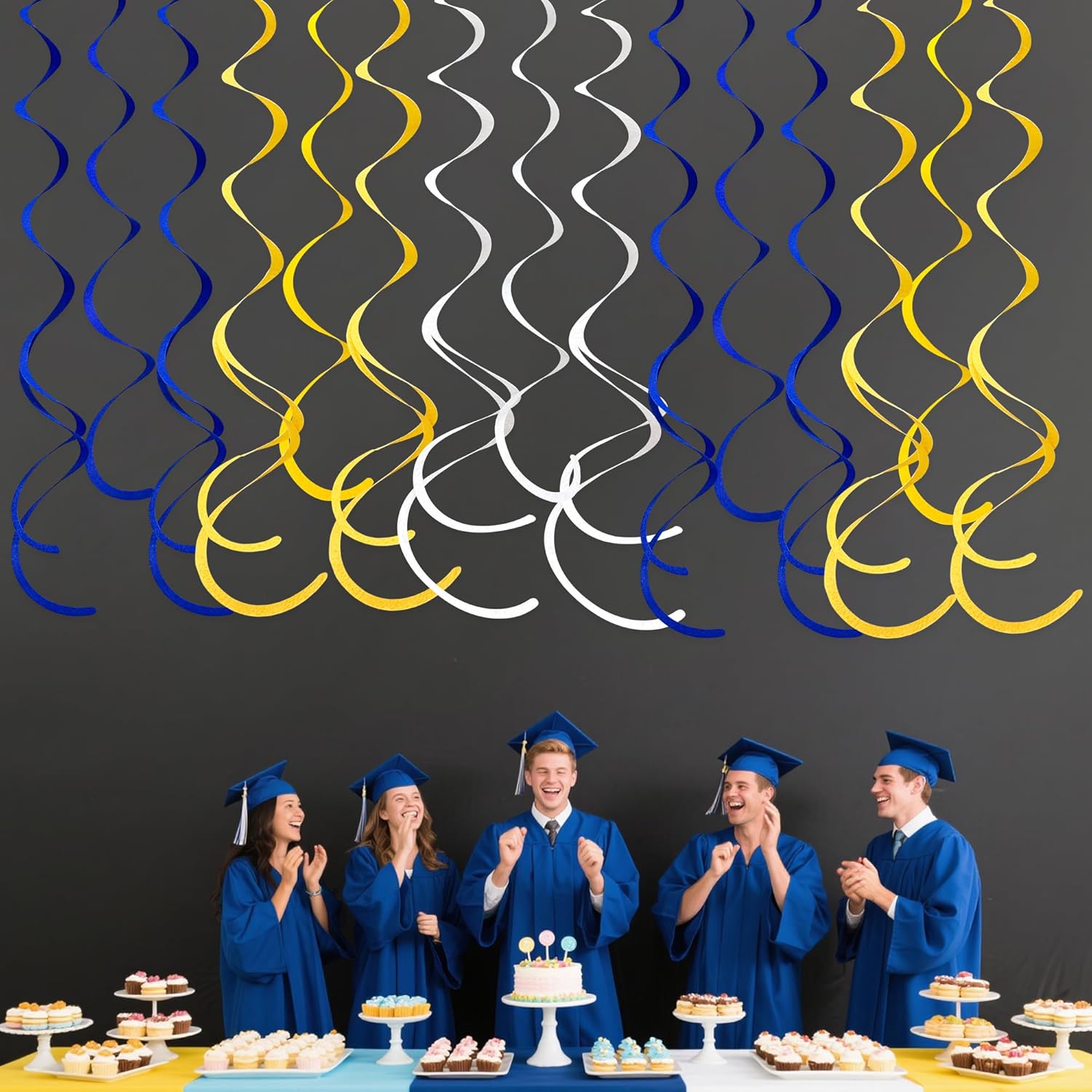 36 Pcs Royal Blue Yellow White Hanging Swirl Decoration Felt Swirl Streamer Spiral Ceiling Decorations Garland for Graduation Birthday Baby Shower Wedding Retirement Nautical Ahoy Achor Party Supplies