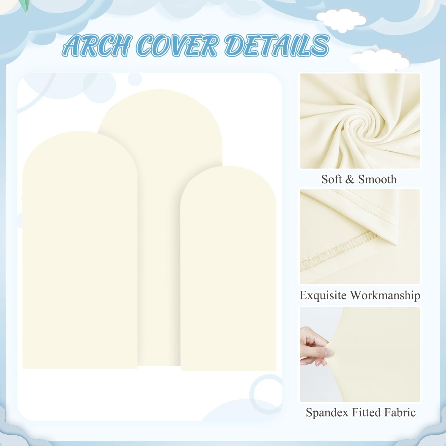 - đ§¸ăSize Information- Arch Backdrop Stand and Cover SetăArch stand and cover set includes 3 gold metal arch backdrop stands and 3 ivory arch cover in sizes 7.2FT x 4FT(H x W), 6.6FT x 3.3FT(H x W) and 6FT x 2.6FT(H x W). The backdrop arch stand with cover is certain to meet your decoration needs and add a charming look to your celebrations.