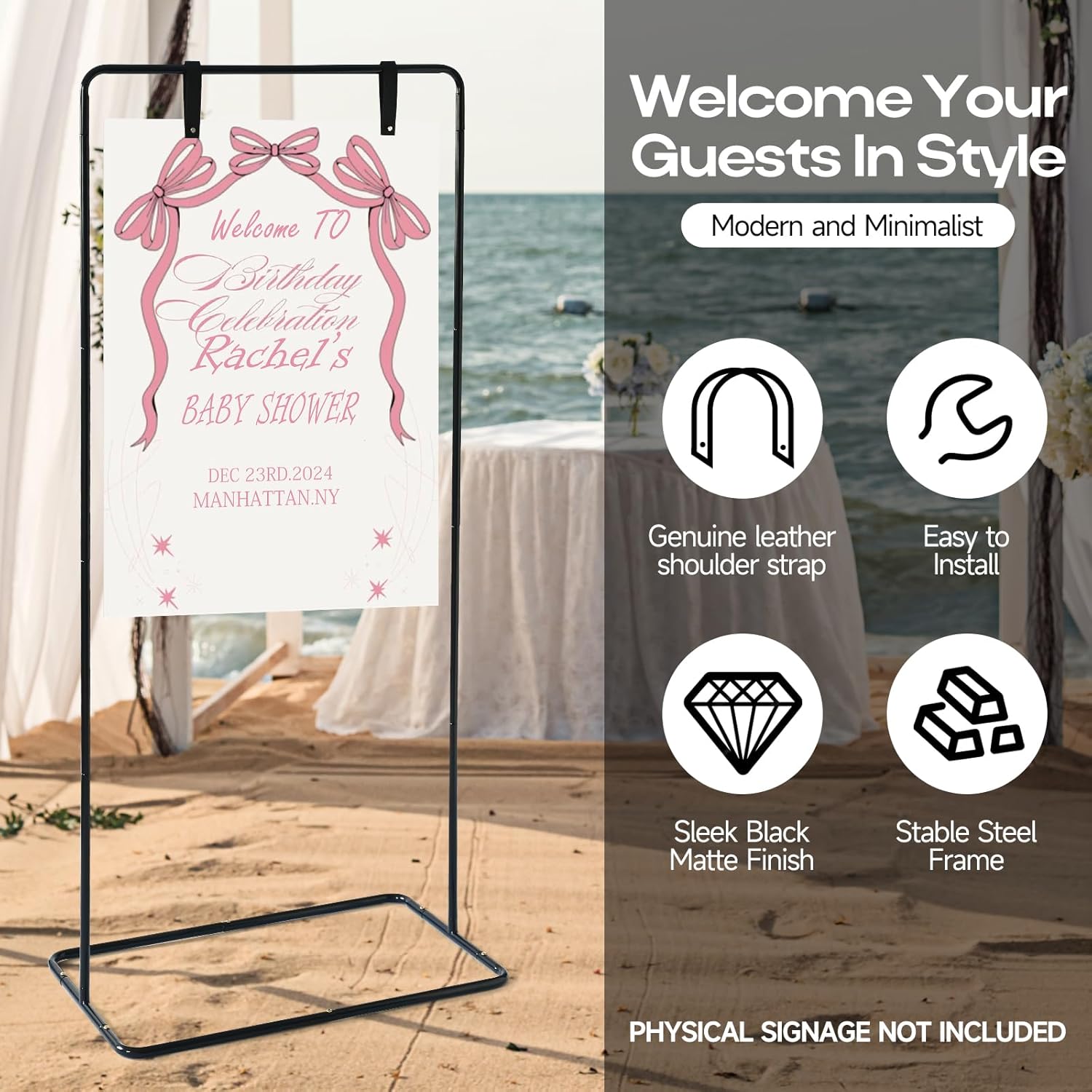 Wedding Sign Stand - Adjustable Wedding Sign W/Design Bundle & Leather Sign Hanging Straps, Durable Metal Easel Stand for Wedding Welcome Signs, Seating Charts, Ceremony & Reception Decor (Black)