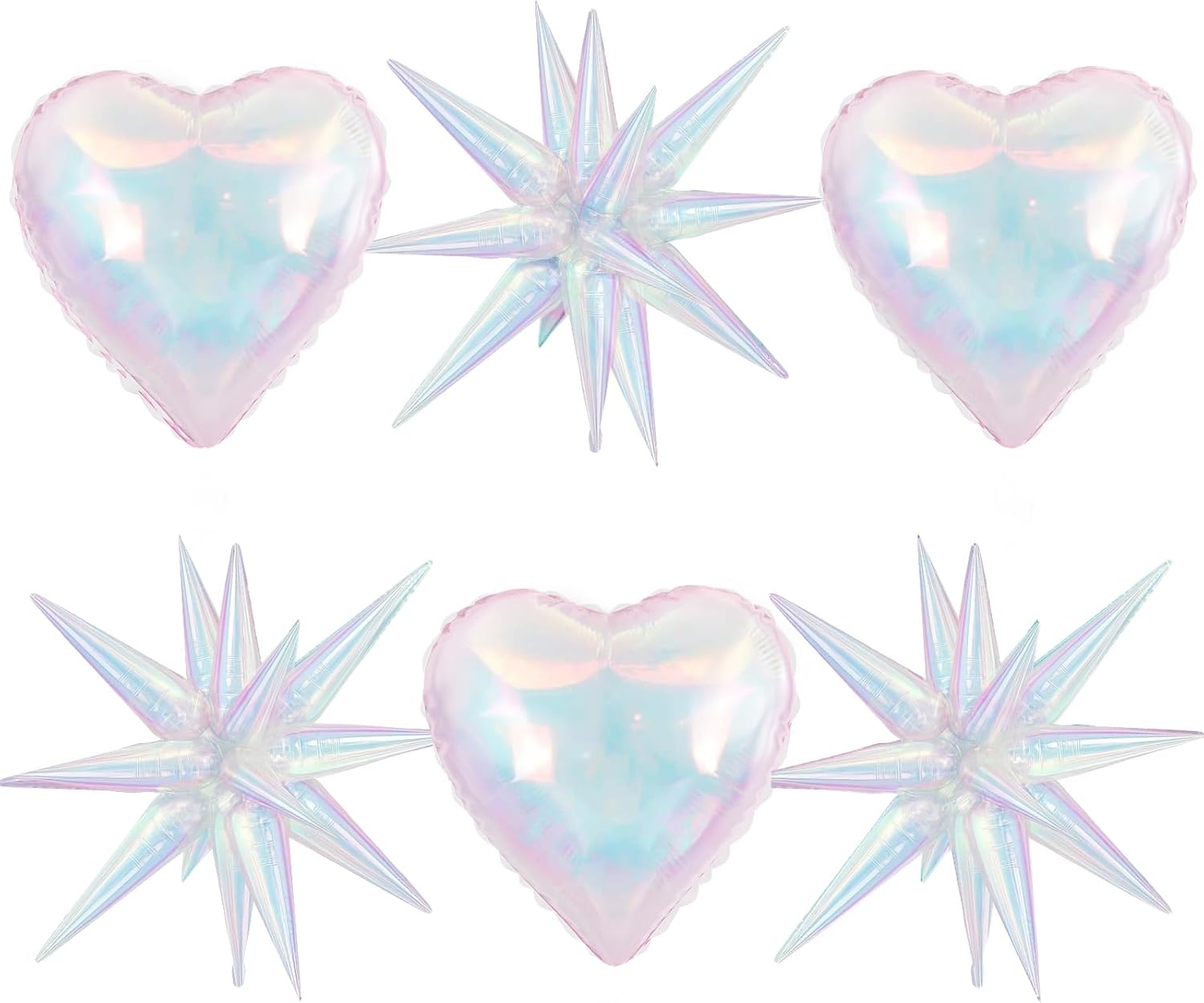6Pcs Iridescent Foil Balloons, 22" 18" Heart Explosion Star Iridescent Balloons Large Holographic Clear Foil Balloon for Birthday Baby Shower Mermaid Rainbow Wedding Party Supplies