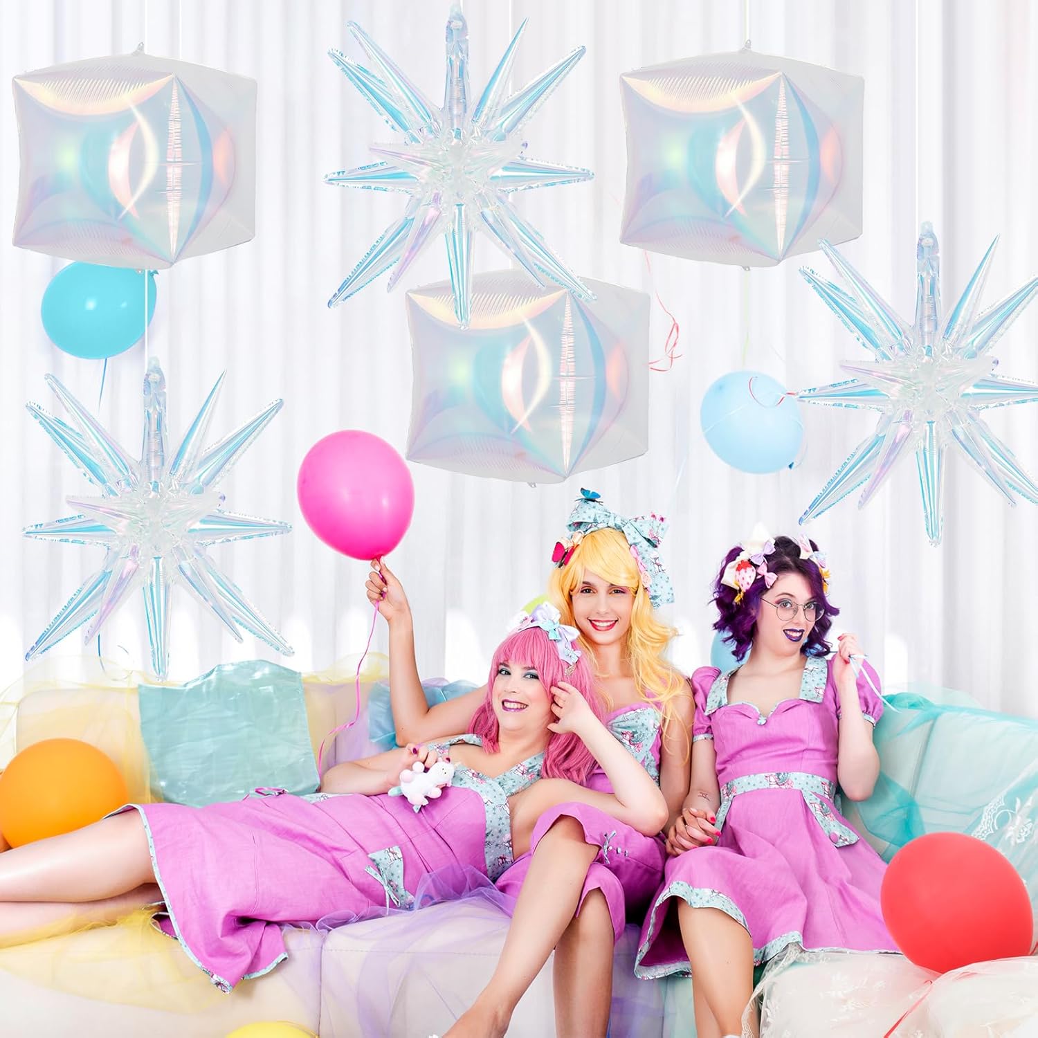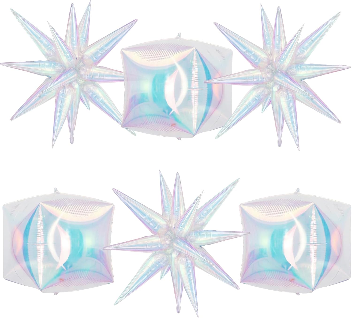 6Pcs Iridescent Foil Balloons, 22in Square Foil Balloons and Explosion Star Iridescent Balloon, Holographic Clear Cube Ball Balloon for Birthday Mermaid Rainbow Wedding Party Supplies