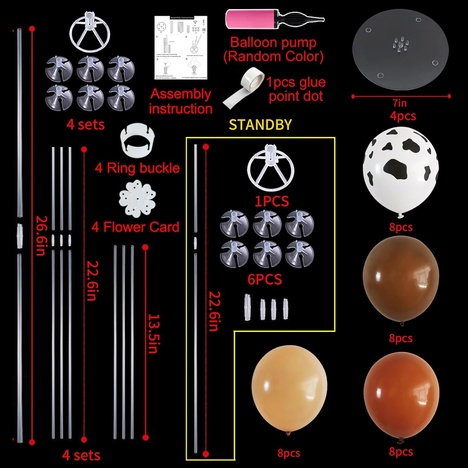 - Package Includes: The balloon arch kit includes 4 reusable balloon stands and 12 inch 32 pcs balloons(8 Apricot balloons,8 brown balloons,8 cocoa brown balloons and 8 cow print balloons),glue point dots,balloon pump,balloon clips,and tie tool.You don’t need to waste money to buy balloons