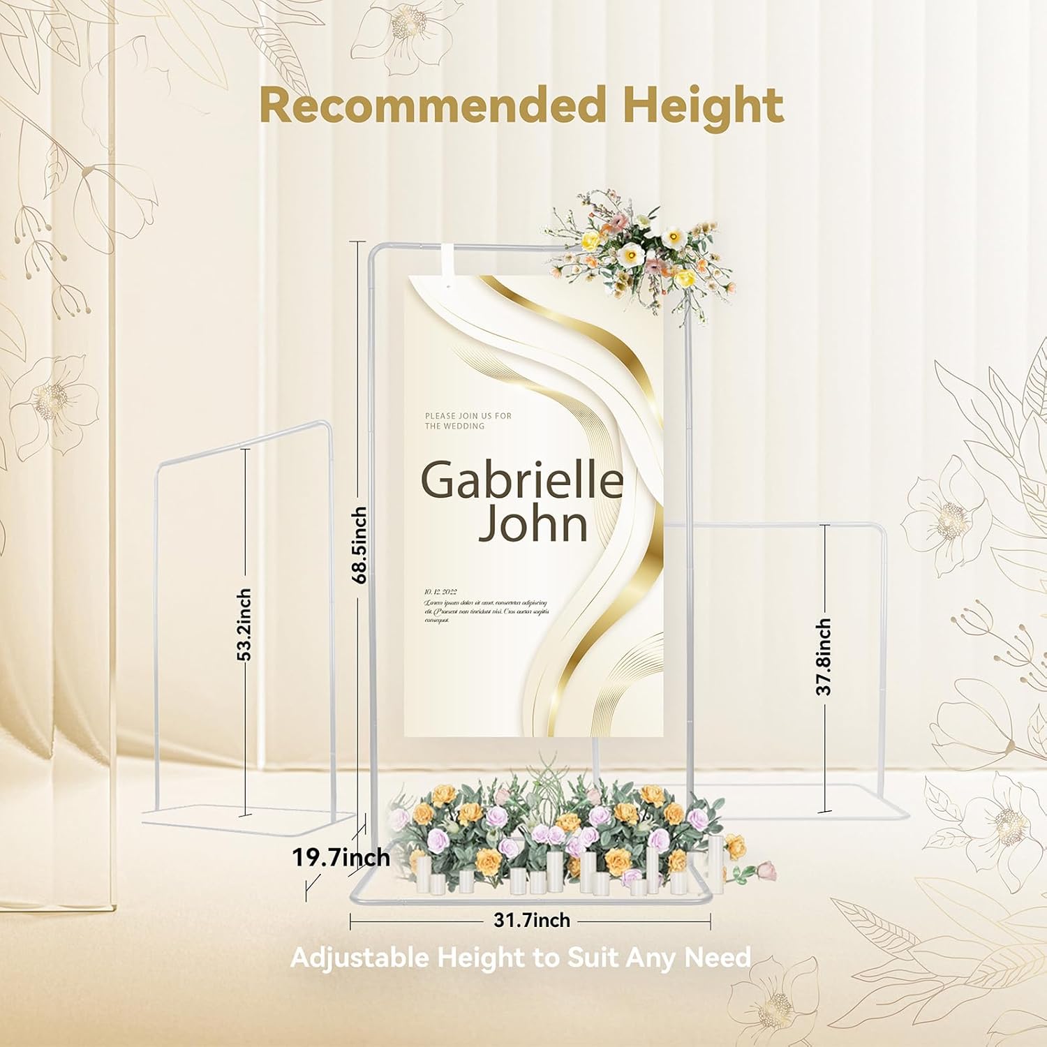 - Adjustable Height: 3 recommended available height (68.5"/53.2"/37.8"). The metal easel stand for sign features a 31.7" wide base, designed to stably support a large sign, poster, seating chart and similar displays & while maintaining refined visual elegance