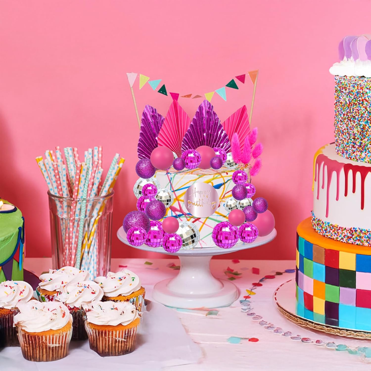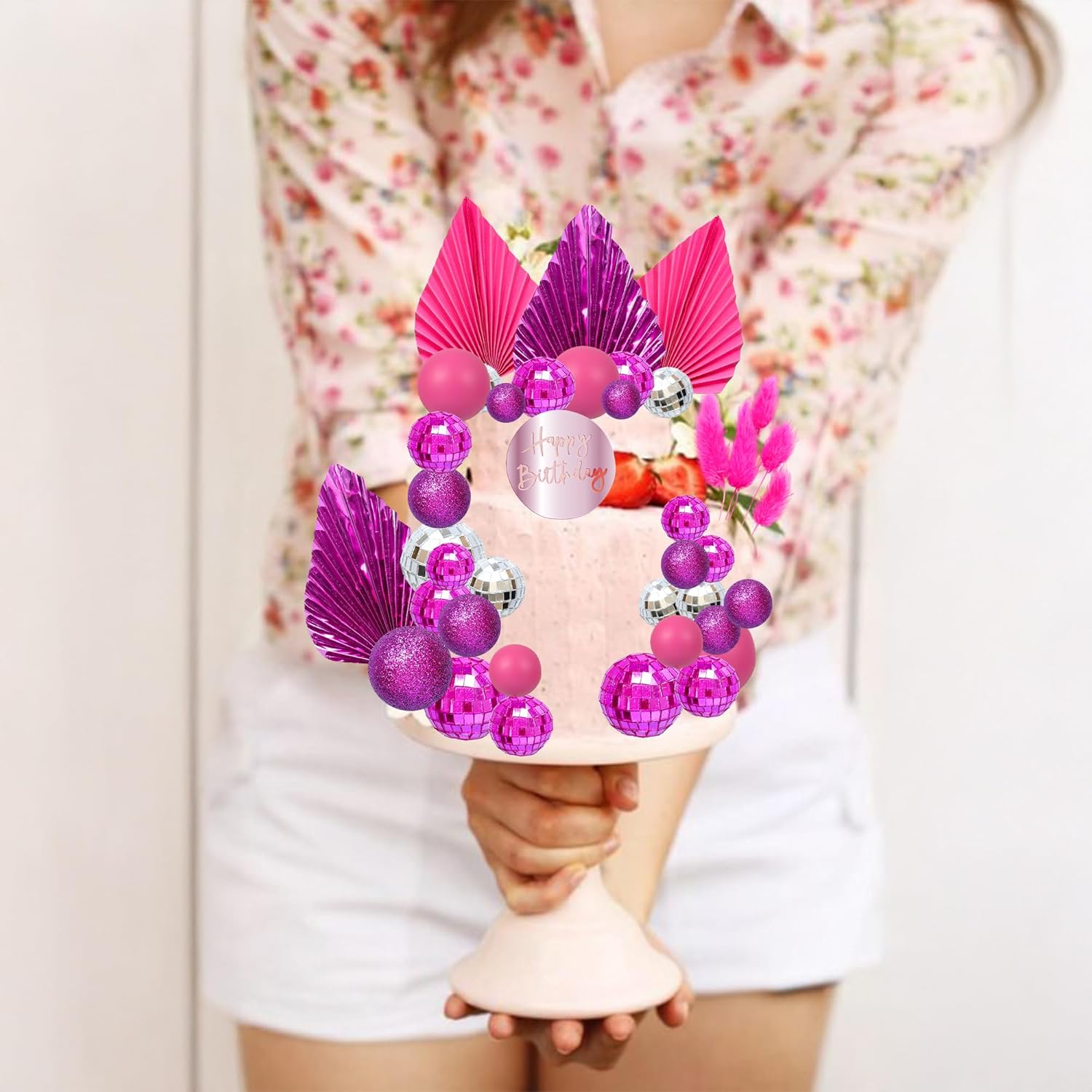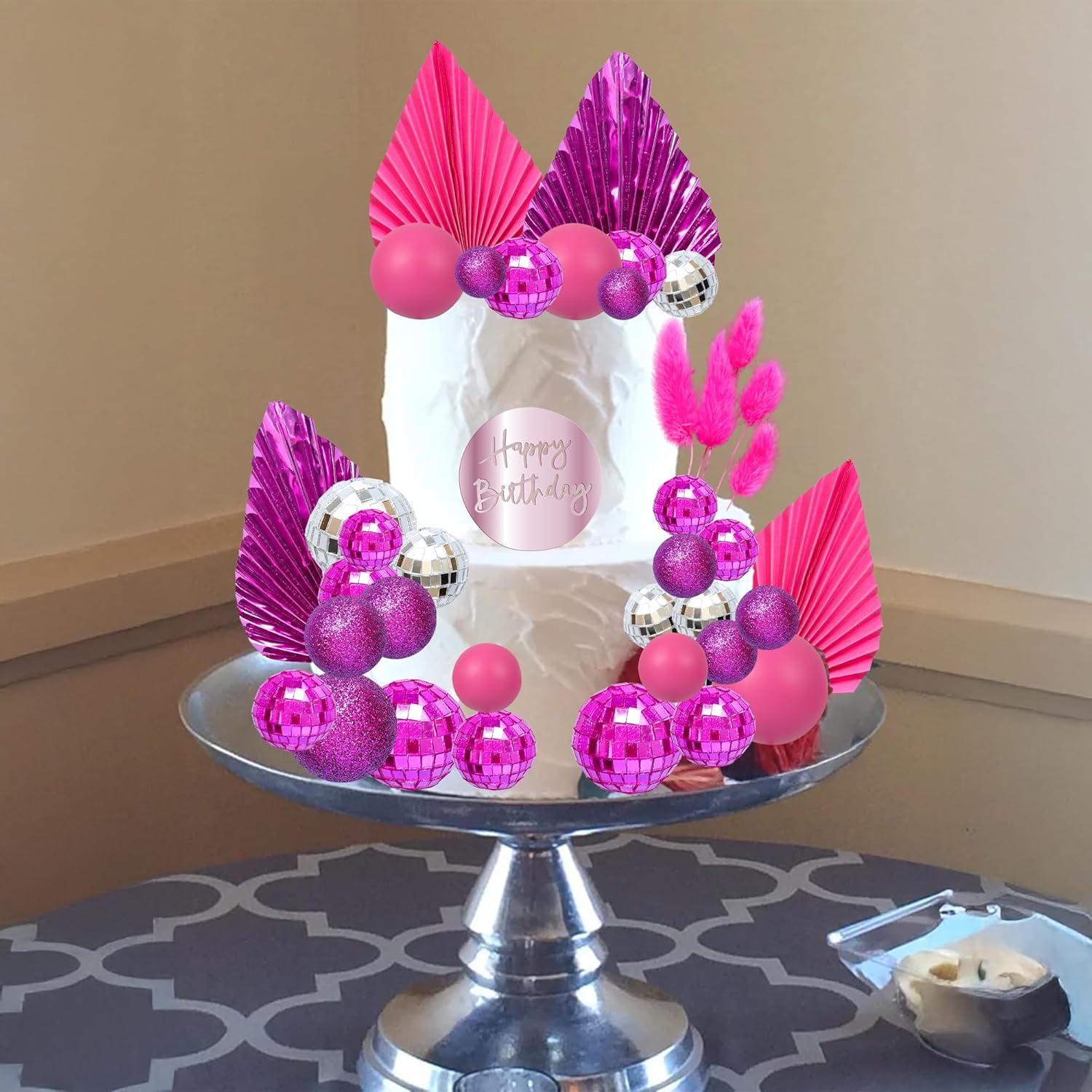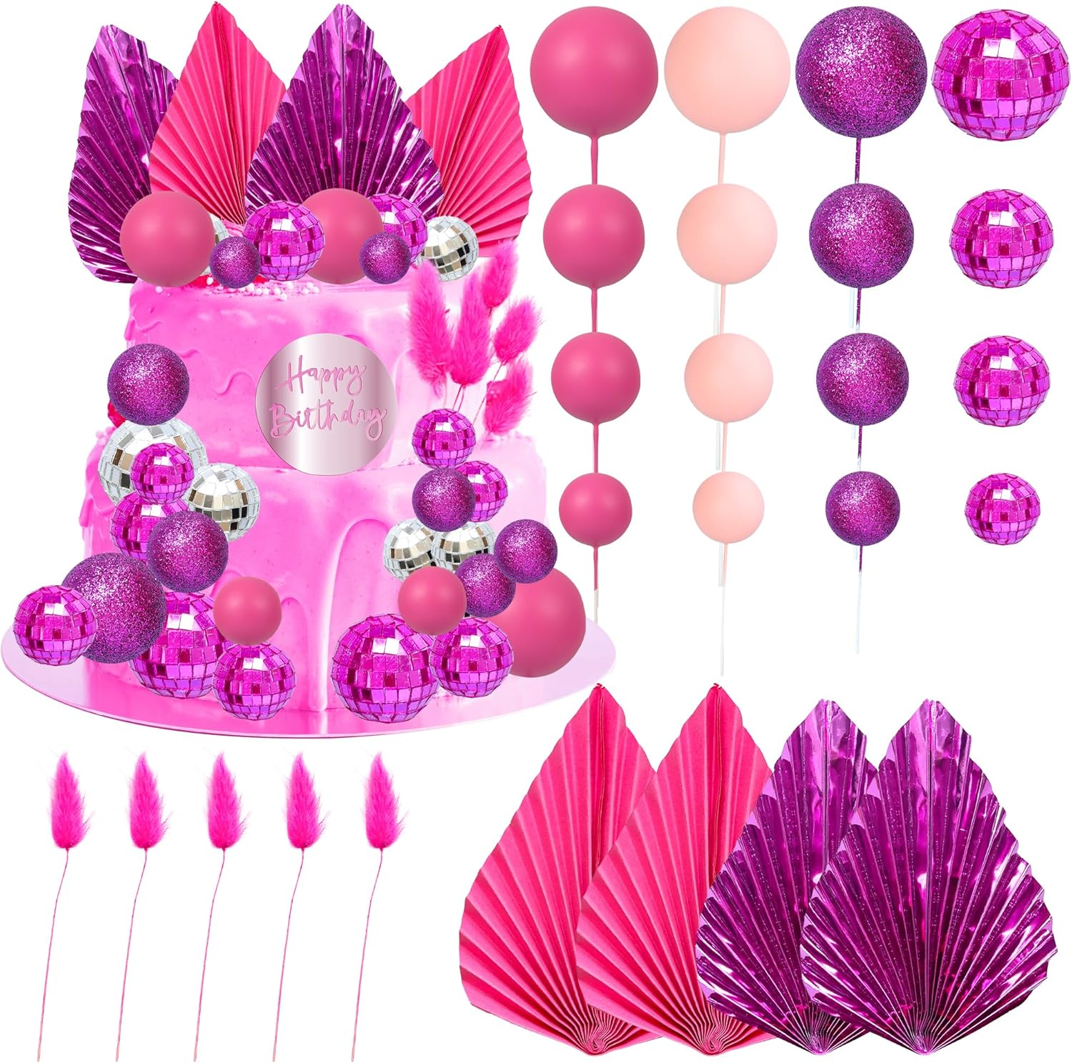 - 【Package Included】: 3Pcs Plam Leaves Cake Toppers + 1Pc Acrylic Happy Birthday Cupcake Topper + 24Pcs Ball Cake Decorations + 5Pcs Rabbit Tail Grasses. These Balls Cake Toppers are very nice and enough quantity for your use. Perfect for boho theme birthday party!