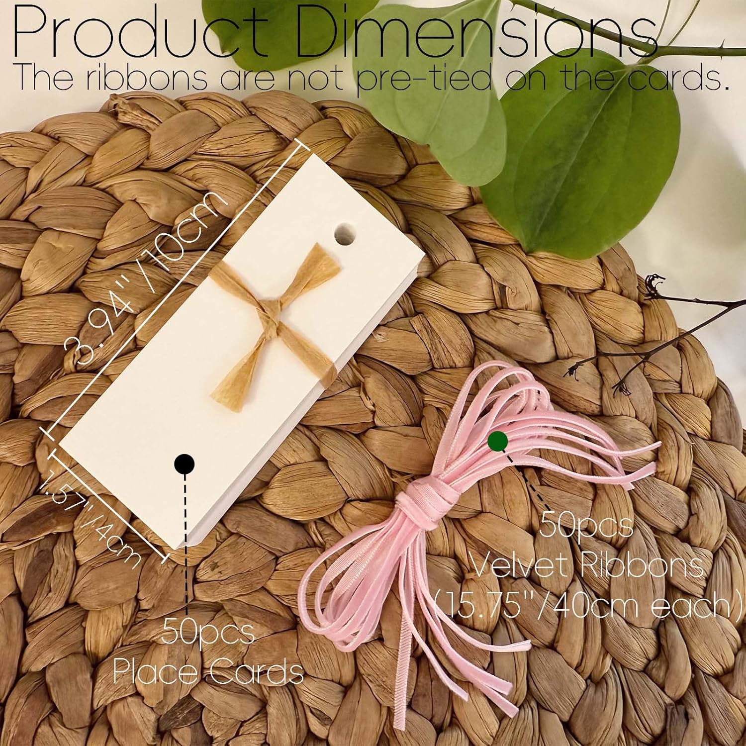 - What's Included :50pcs place cards (3.94'' x 1.57'') and 50pcs velvet ribbon (15.75" each). The ribbons are not pre-tied on the cards