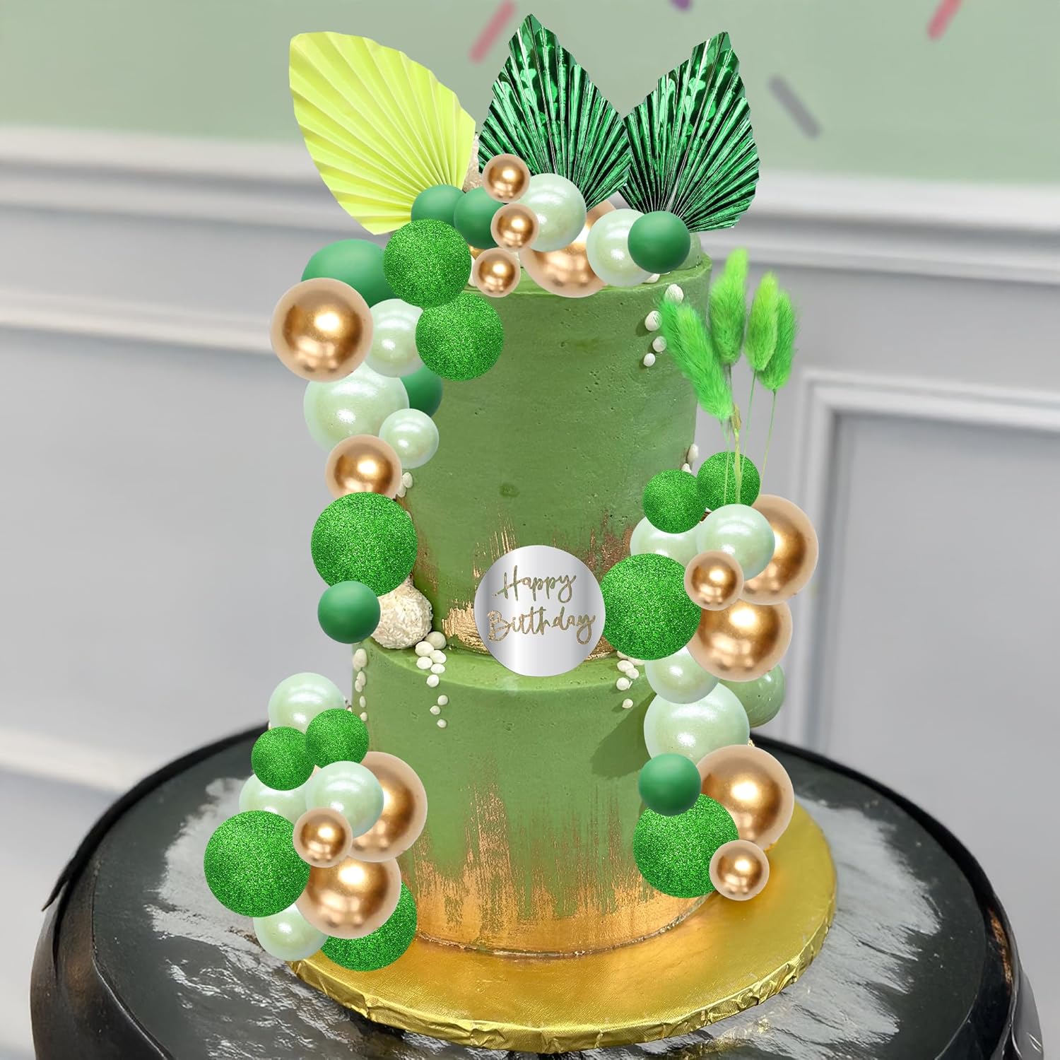 Ephlyn 33 Pack Balls Cake Toppers Boho Palm Leaves Cake Decorations Round Acrylic Happy Birthday Cupcake Toppers for Birthday Wedding Baby Shower Party Supplies Green