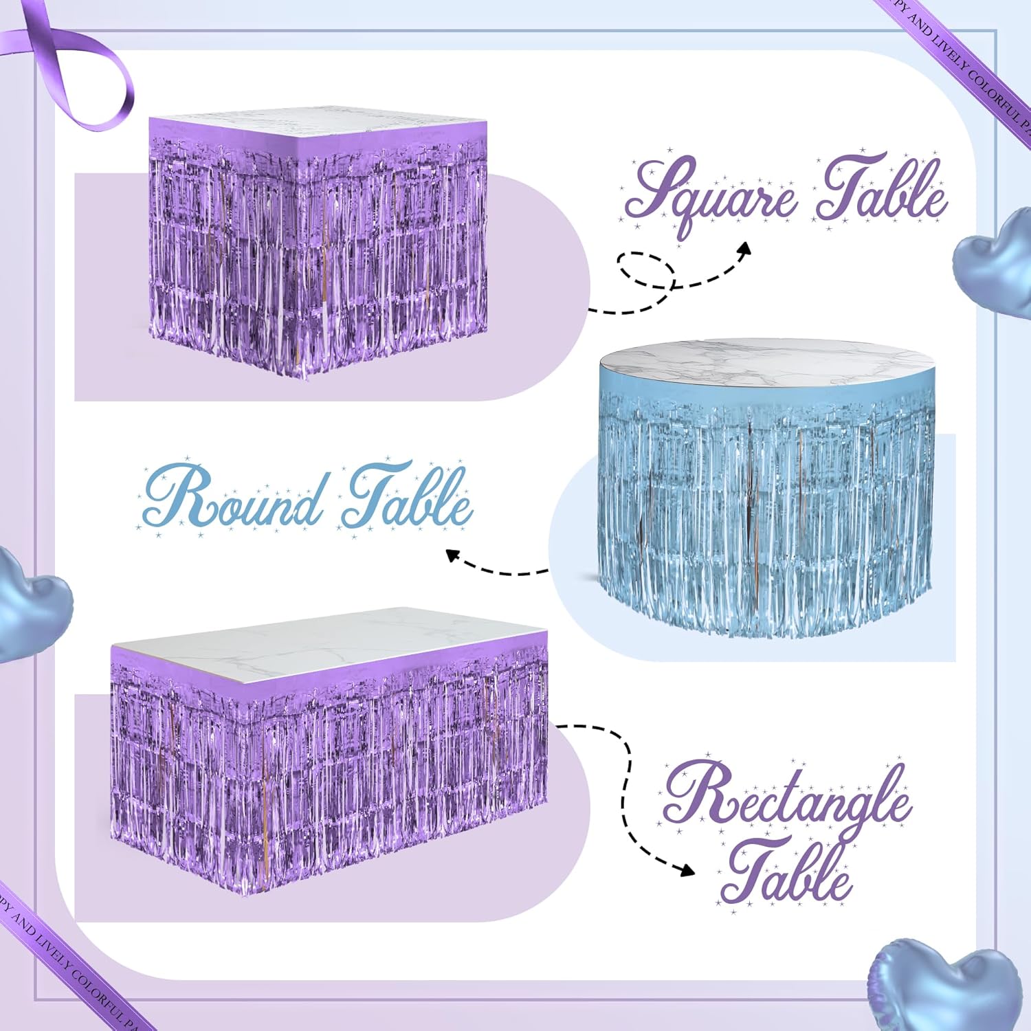 2 Pack Light Blue Light Purple Table Skirts, 29x108" Metallic Foil Tinsel Fringe Table Skirt for Rectangle Tables Streamer Curtains Backdrop, Party Decorations for Birthdays, Weddings, Holidays