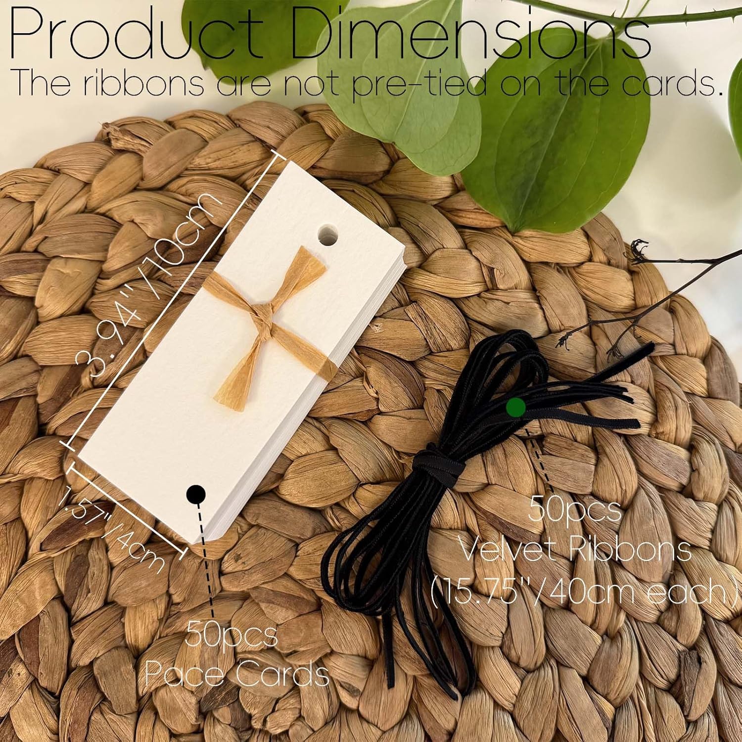- What's Included :50pcs place cards (3.94'' x 1.57'') and 50pcs velvet ribbon (15.75" each). The ribbons are not pre-tied on the cards
