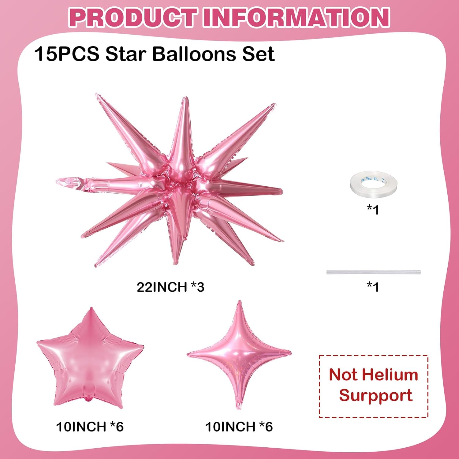 - Pink Star Balloons Set: Package includes: Pink aluminum foil star balloons (explosion stars Ă— 3, four-pointed stars Ă— 6, five-pointed stars Ă— 6) , a straw and ribbon