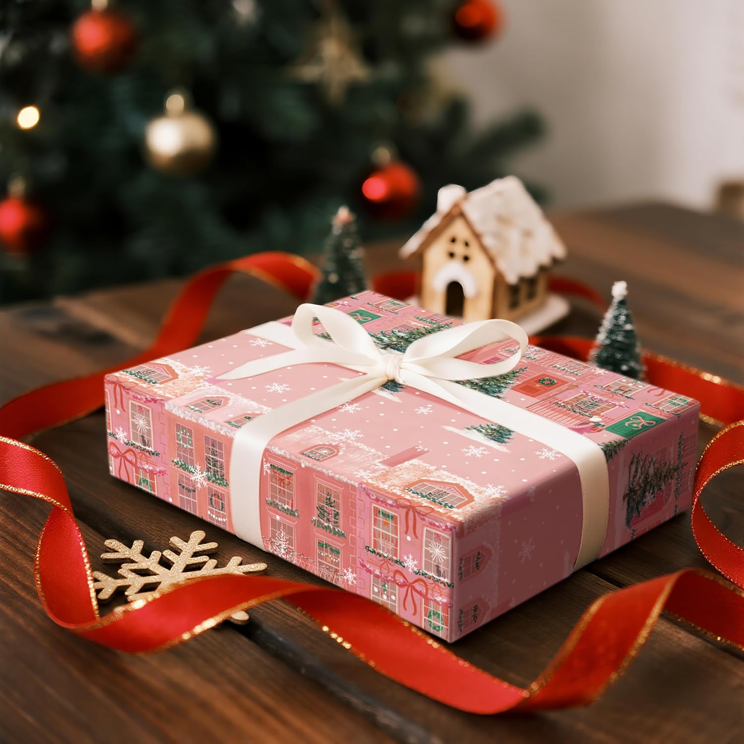 LeZakaa Pink Christmas Wrapping Paper Roll for Girls Kids, Winter Street Scene Romantic Townhouse with Snowflakes for Holiday Gifts, Family Friends, Winter Wonderland, Mini Roll 17 in x 16.4 Ft