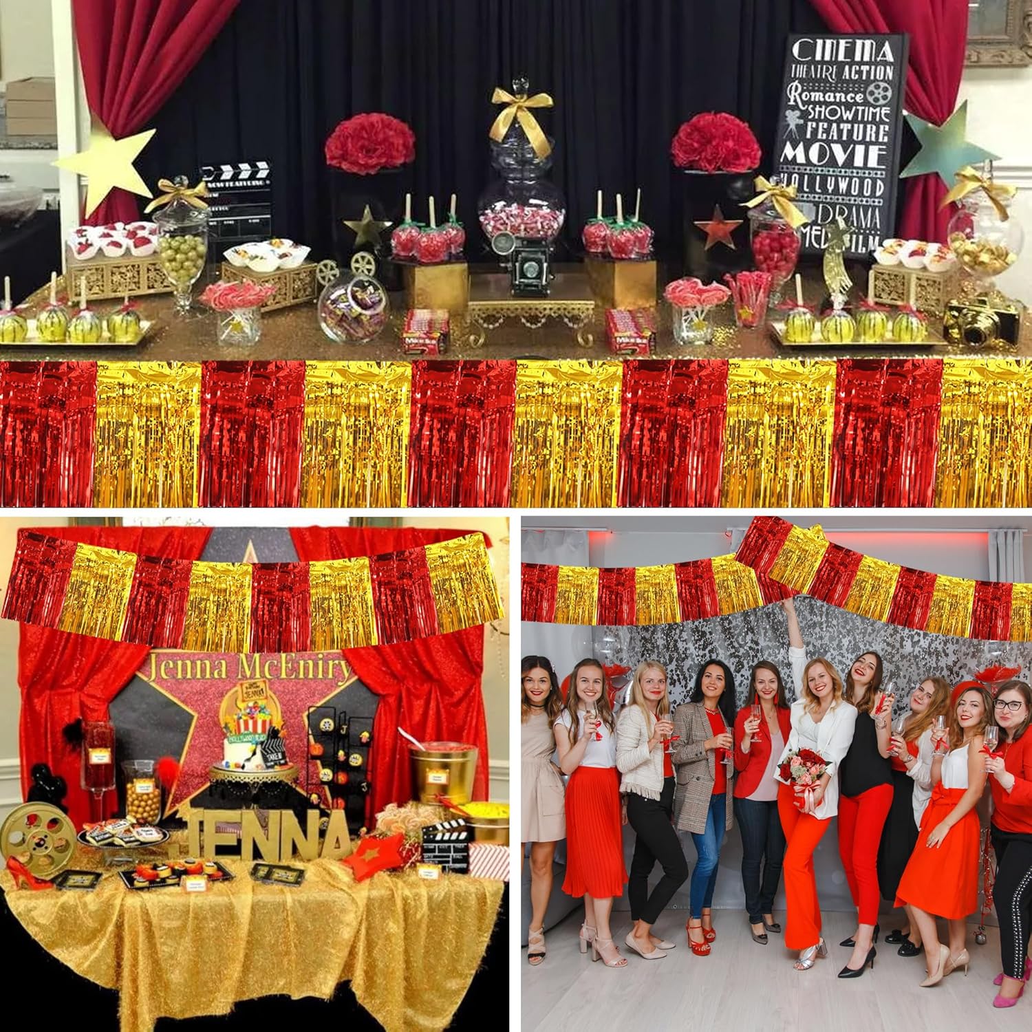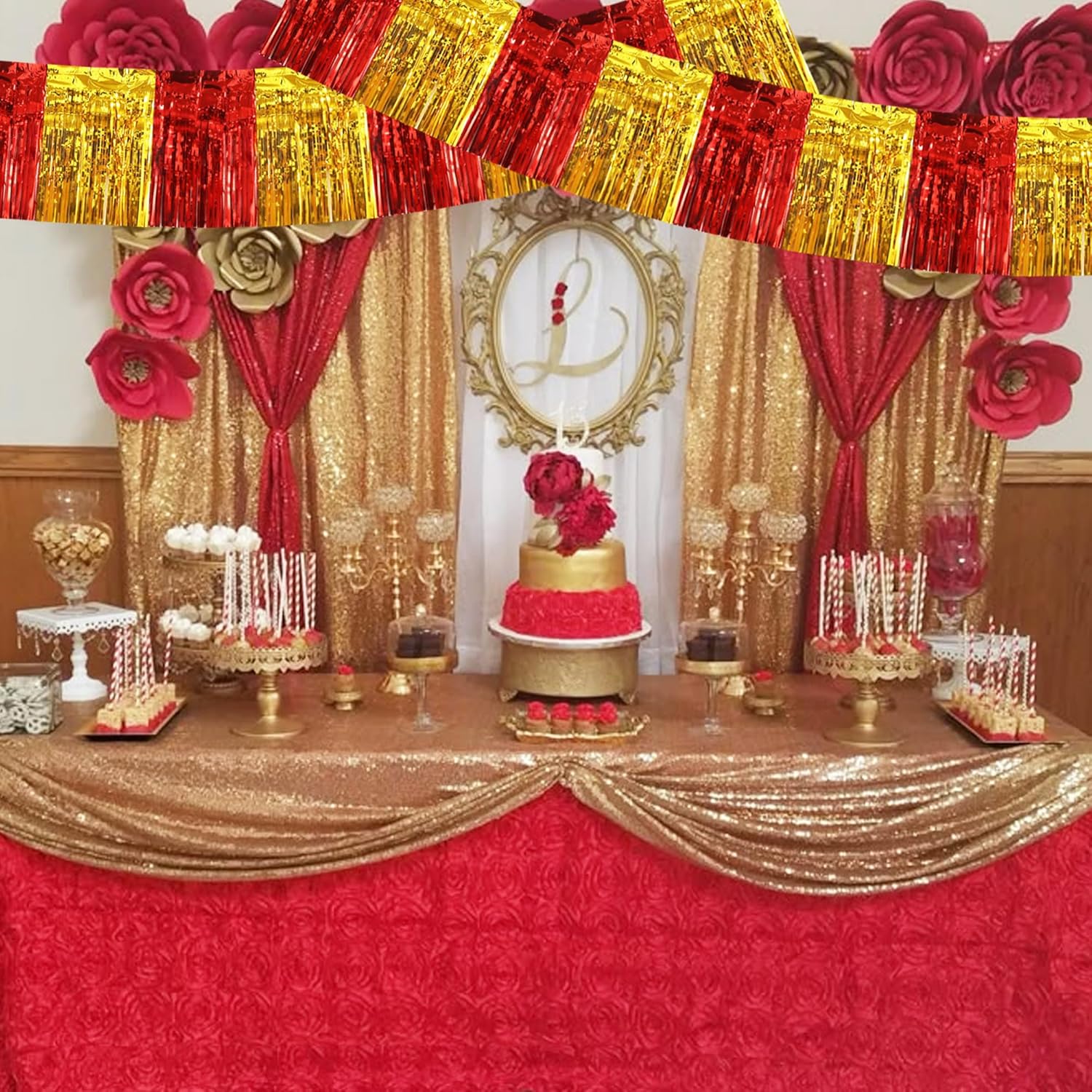 BEISHIDA 3 Packs Metallic Foil Fringe Garland Red Gold Wall Hanging Tinsel Fringe Banners for Car Floats Bridal Shower Wedding Birthday Easter Graduation Holiday Party Decoration(30 Feet)