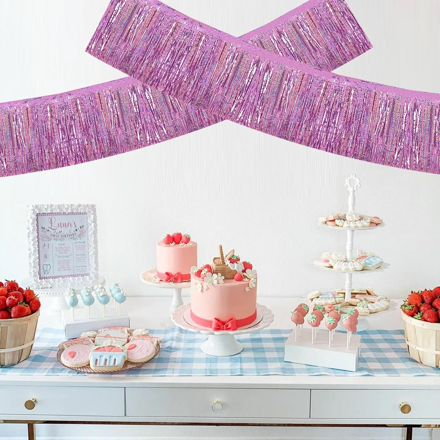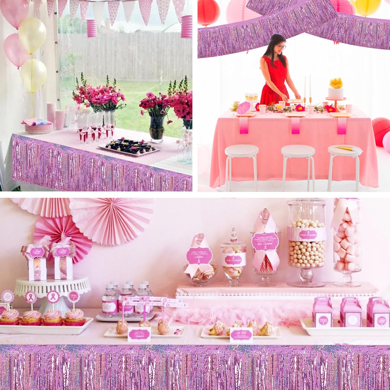 BEISHIDA 3 Packs Metallic Foil Fringe Garland Laser Light Pink Wall Hanging Tinsel Fringe Banners for Car Floats Bridal Shower Wedding Birthday Easter Graduation Holiday Party Decoration(30 Feet)