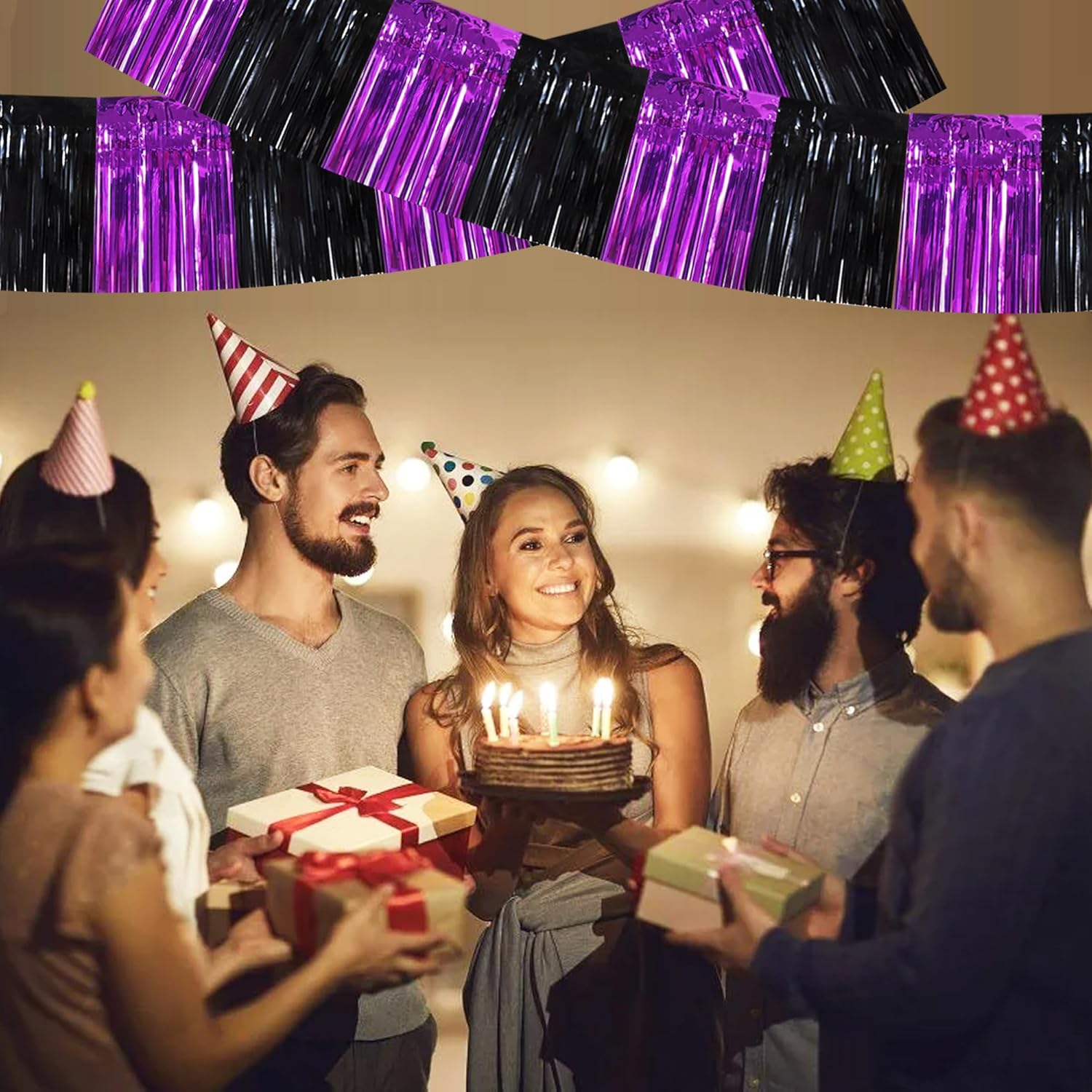 BEISHIDA 3 Packs Metallic Foil Fringe Garland Black Purple Wall Hanging Tinsel Fringe Banners for Halloween Car Floats Bridal Shower Wedding Birthday Easter Graduation Holiday Party Decoration (30 Ft)