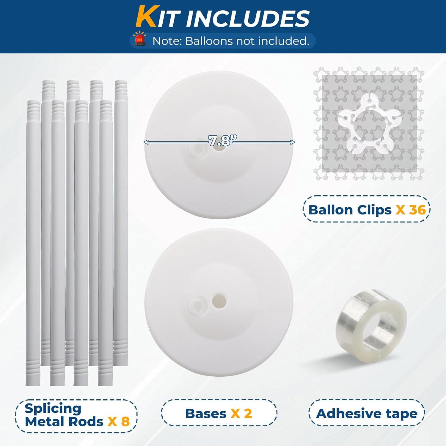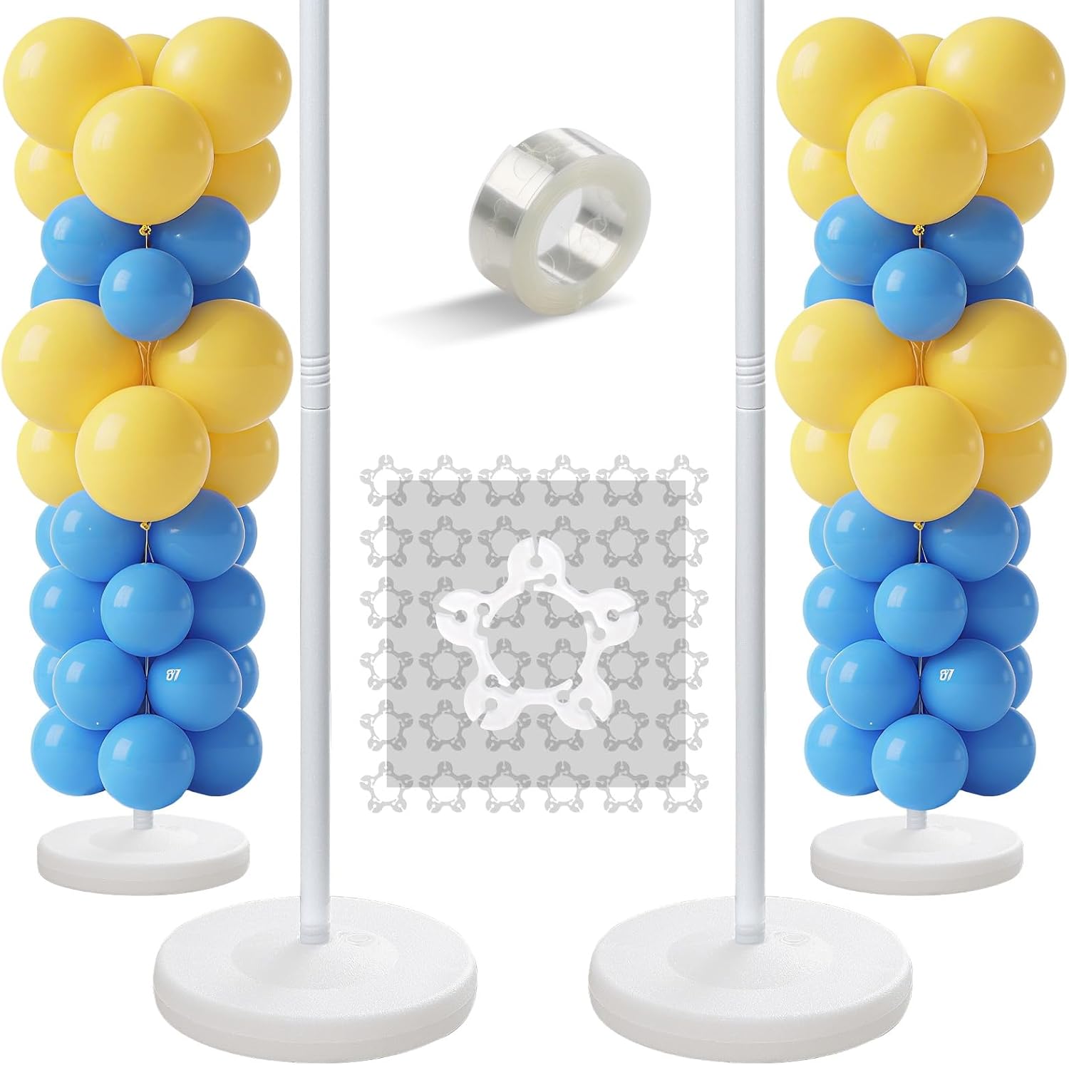 - âś… Balloon Pillars Stand Kit Includes: 2 bases, 8 rods (each 15.7 inches long), 36 balloon clips, and 1 roll of balloon tape. Note: Balloons are not included.