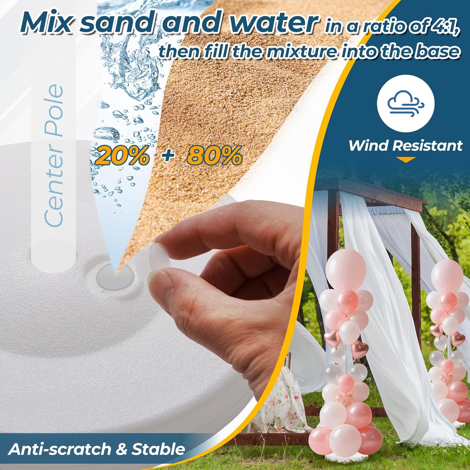 - âś… Wind-Resistant Design: The balloon stand base is made of PVC material. Mix sand and water in a 4:1 ratio, then fill the mixture into the base to create a highly stable balloon stand.