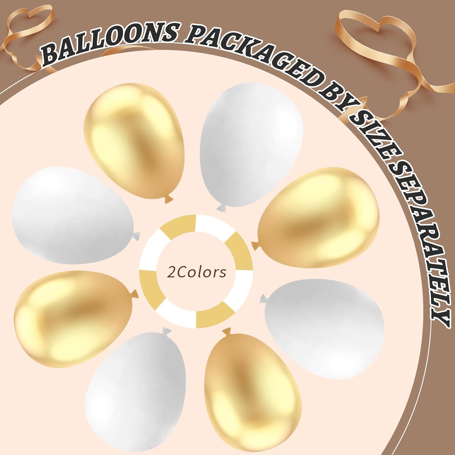 - Package List :gold and white balloon arch kit includes 18" white /metallic gold balloons(12 pcs), 12" white /metallic gold balloons(100 pcs), 10"white /metallic gold balloons(100 pcs), 5" white /metallic gold balloons(100pcs),glue dotsx200, ribbonx2, decorative stripx2. plenty in quantity, Perfect for White Metallic Gold Latex Balloon Garland kit and party balloons